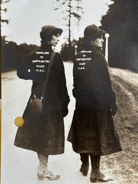 In March 1915, Jane A. Ellis (left, age 25) and her mother Anna Metkser Mills (age 47) prepare to walk from Portland to San Francisco in 40 days. Photo courtesy Portland City Archives, a2000-003.