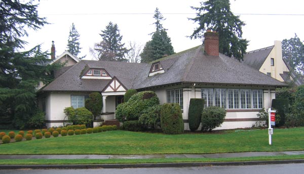 3032 NE Regents Drive, Portland, Oregon. Built 1923 by C.O. Waller at a cost of $12,000, which was a lot of money in 1923. This was on the high end for construction costs of other houses built in the neighborhood at the same time. Some families who have lived here over the years have used the west wing of the house (with all the windows you can see above) as a place for their books.