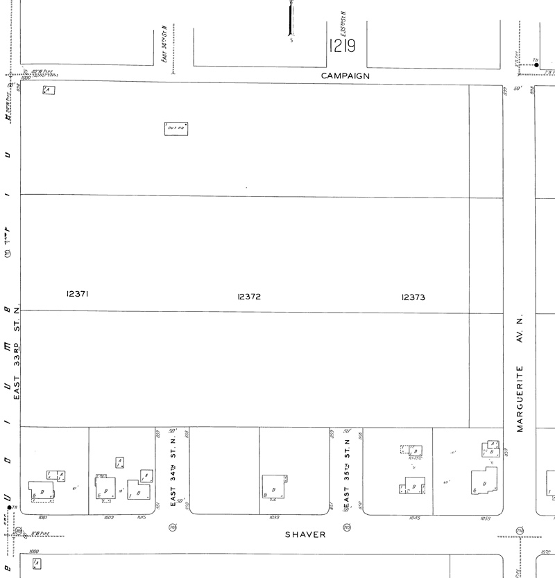 Here’s the Sanborn Map from 1924 that shows the 33rd Street Woods (now Wilshire Park). Note the outhouse situated in the northwest corner, and “Campaign Street” (now Skidmore). Marguerite Avenue is now NE 37th. This is a detail from Sanborn panel No. 1220. Click for a larger view.