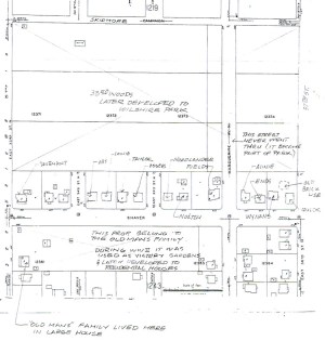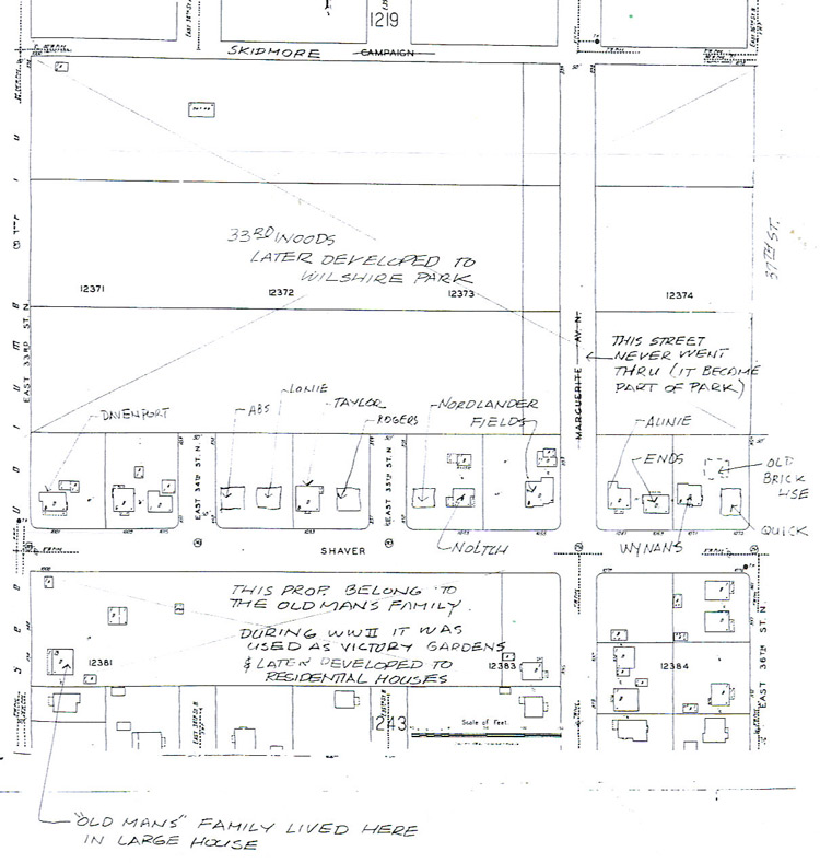 A couple of observations here: Note that the property on the south side of Shaver Street was a victory garden during the 1940s. Interesting too to point out there was an old brick house in the far southeast corner of Wilshire Park that Dick says was torn down. Have a look at his annotated map: