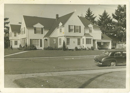 This Colonial Revival home at the corner of NE Regents and Dunckley was built in 1939 by Frank A. Read, a prolific Alameda builder of the 1930s and early 1940s. Use of brick around the entry door brings a modernizing touch to the traditional clapboard exterior. The plunging roofline from the roof peak to above the entry traces a link to early 17th Century New England homes. The use of a garrison style overhang between the first and second floor, and pendant drops at the corners, clearly ties the design to its colonial influences. Other Frank Read homes of this period use many of the same building materials and design references. Photo courtesy of John Haleston.