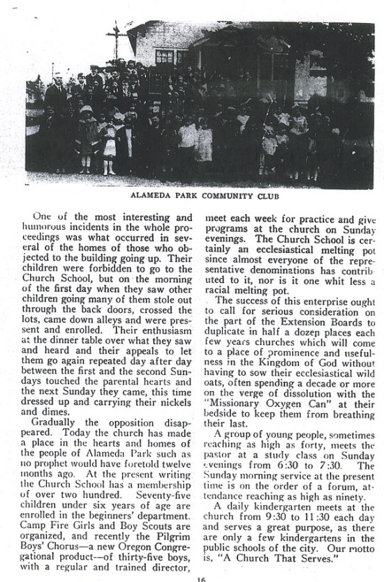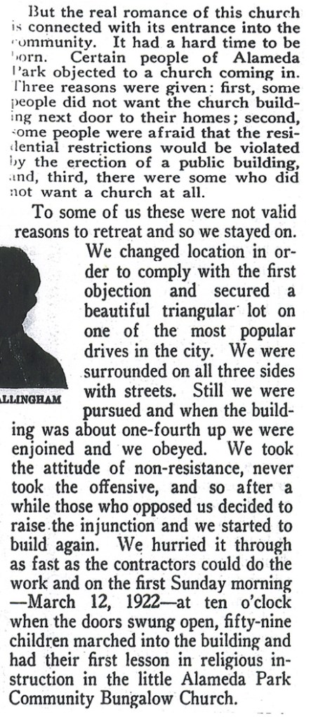 There are always at least two sides to any story (usually a lot more), and we’ve recently found a description of the events surrounding the neighborhood opposition to the Alameda Park Community Church that sheds further light on exactly what happened around here in the fall of 1921.