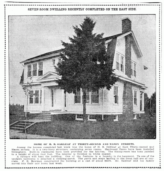 Constructed originally for $6,500 for H.B. Oakleaf and his family, the home changed hands across the generations and along the way stylistic “updates” and maintenance began to change the look of the home’s exterior. Aluminum siding was put up over the original cedar shake siding. Wooden windows were pulled out in favor of the dreaded aluminum slider windows. Wooden trim, sills and lentil molding were removed. Much of the original charm seen in this photograph — which ran in The Oregonian on September 6, 1914 — was slowly drained away.