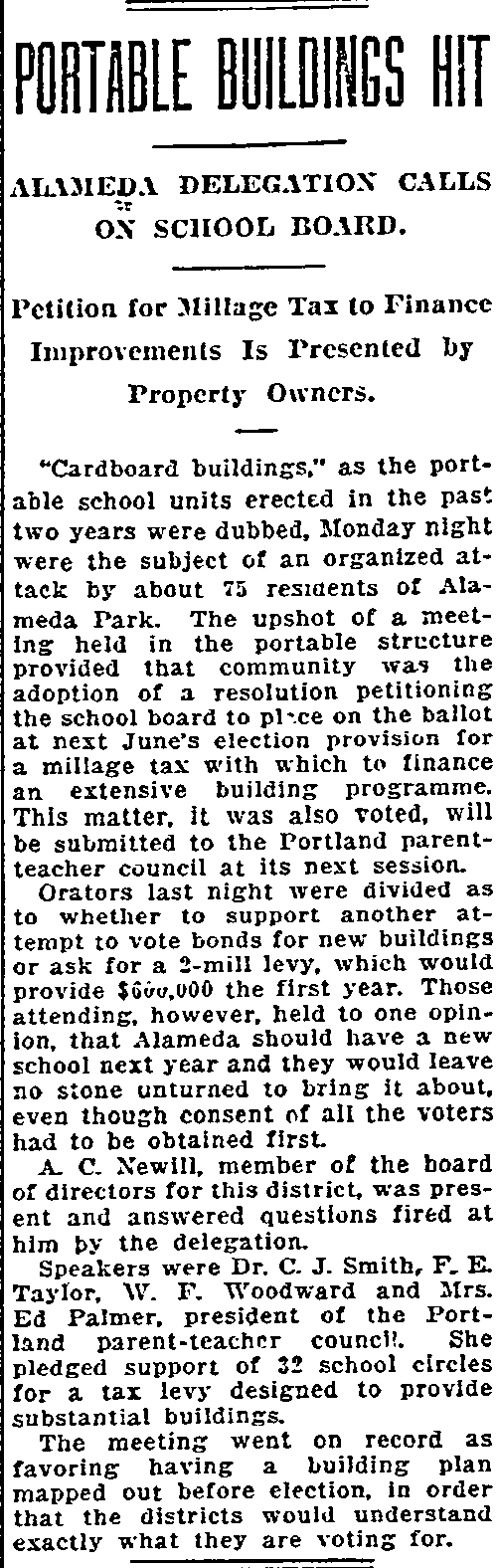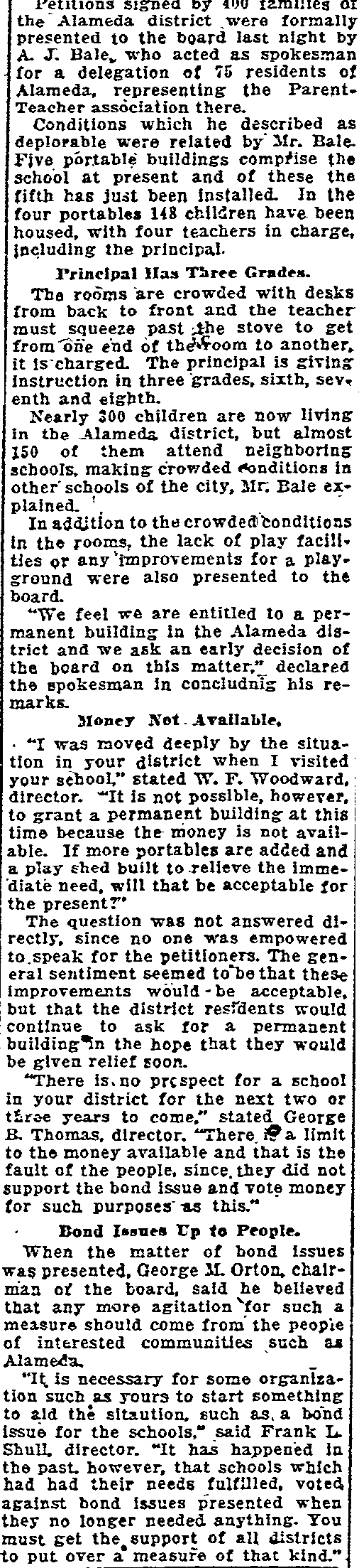 Over the next several years, the portables multiplied into a compound of buildings and by October 1919, Alameda parents (there were more of them by now) held a rally of sorts, signed a petition and expressed their readiness to levy a tax against themselves to build a building: