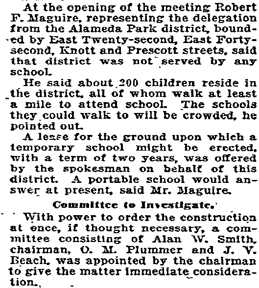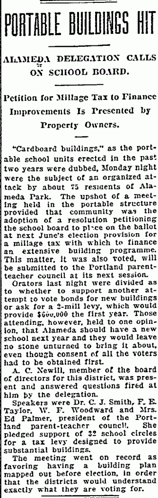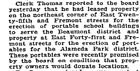 Construction of Kennedy School on NE 33rd was underway which may well have just served to irritate Alameda parents, who felt there should be a school here too. By October, the Board was ready to provide a temporary solution, leasing a 200-foot by 500-foot lot on the northeast corner of 25th and Fremont for several temporary buildings: