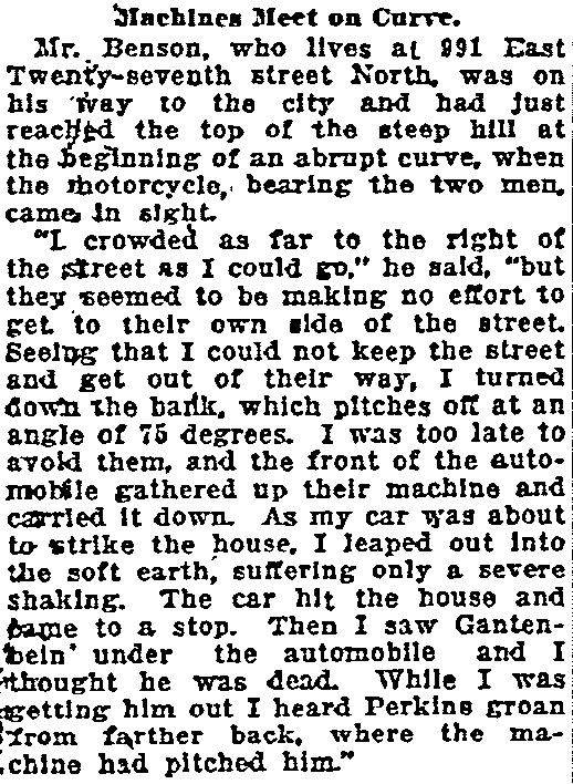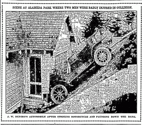 The same story that carried news of the fatal accident also described the hill as a perilous spot and the scene of other accidents. Indeed, an earlier news story, this one from April 19, 1912, described a serious but non-fatal collision between a motorcycle and a car near the top of the hill that ended up with the car over the side and smashed into a just-finished (and now much remodeled) house, and motorcycle driver and passenger pinned under the car.