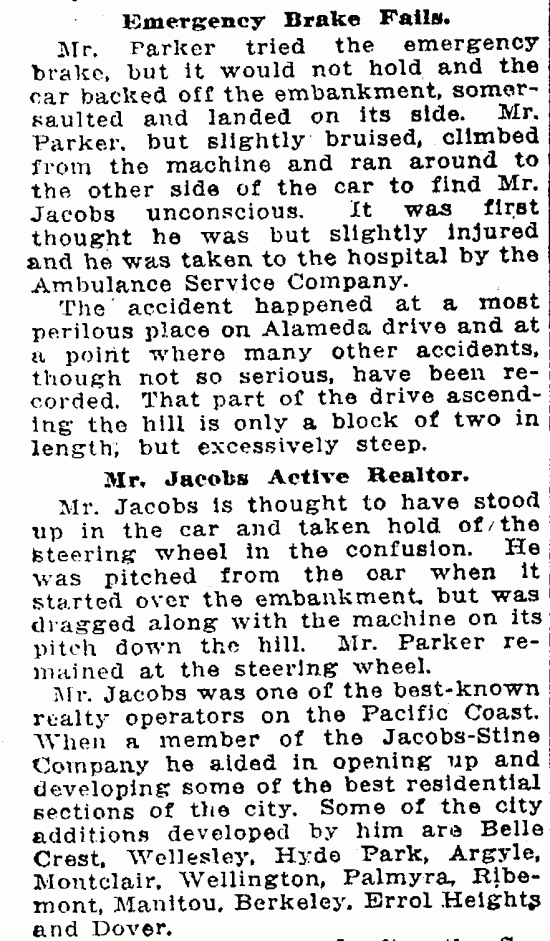 Fred A. Jacobs, art collector, civic booster, real estate broker and owner of the Fred A. Jacobs Company, had set out with his employee J.P. Parker to drive through Alameda on their way to have a look at rental properties in the Vernon neighborhood. At the time—and well up until the 1970s, we’ve been told—Stuart Drive was a two-way street. On the morning of June 5, 1917, they started up Stuart Drive on their route north. Why they chose Stuart Drive over the gentler and wider Regents Drive is anyone’s guess. The car made it about half way up the hill, but then stalled out and started to roll backwards down the street. Unfortunately for Parker and Jacobs, the emergency brake did not hold and the car rolled to the far left side of the street, went backwards over the curb, bumped over the small sliver of property that goes with the lovely George A. Eastman-designed Craftsman home there on the hill, and then flipped over hard, landing on its side 25 feet below on Ridgewood Drive. Here’s what The Oregonian said the next morning: