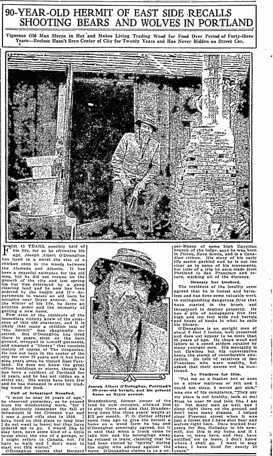 Here’s a little gem we found recently that we’ll pass along as a New Years treat for faithful readers. From The Oregonian on September 18, 1921, the story focuses on local “hermit” Joseph Albert O’Donaghue, who reportedly lived in a shack here in Alameda on Bryce Street. A grain of salt is probably helpful as you track old Joe’s story, travels and age. But even if it seems a long shot that he was hanging around the Alameda Ridge back in the 1880s, the fact is he had been living for a while in the brush near today’s Bryce Street when the reporter found him. That’s enough to reset our mental picture of the neighborhood we think we know, and to feed our imagination.