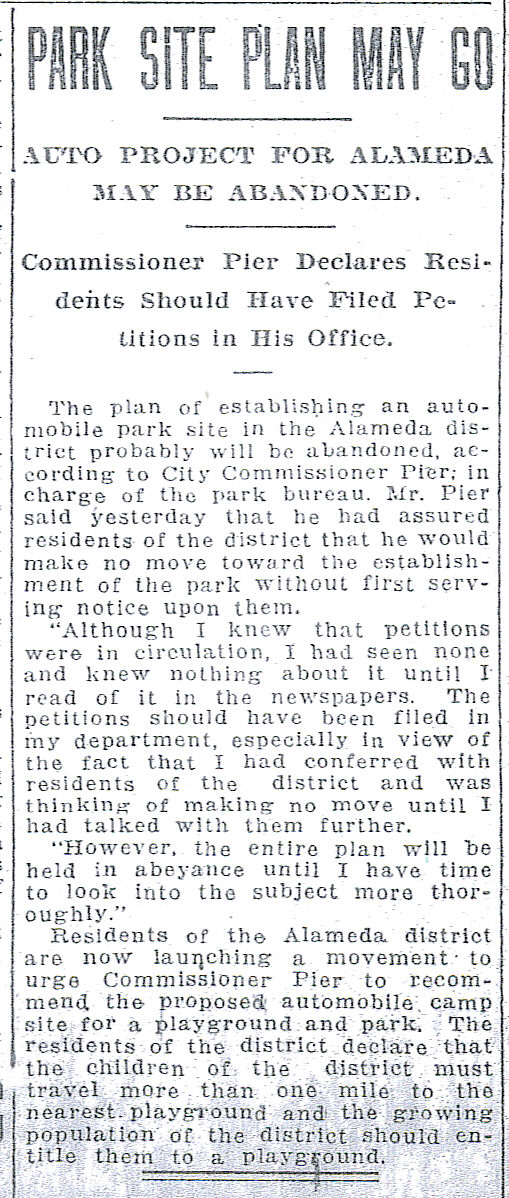 In the following day’s story, with some plausible deniability and backpedalling by Pier, City Council quickly reversed direction on the plan and endorsed the neighborhood notion of playgrounds and open parks.