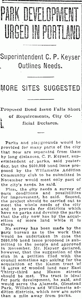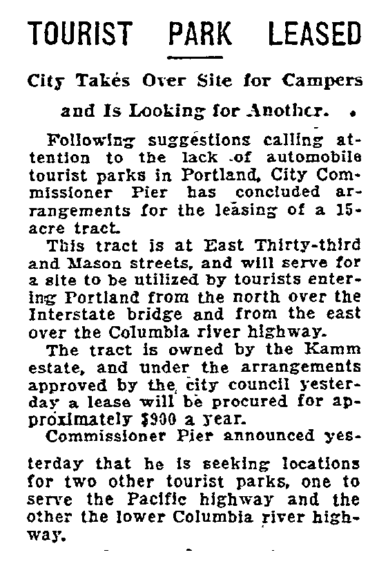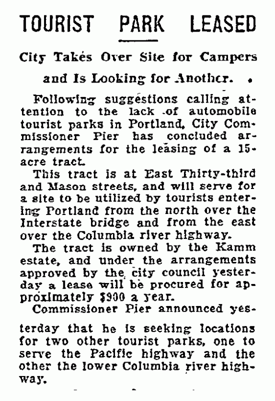 Eventually, the city found property and built an auto park near Peninsula Park in the vicinity of Ainsworth and Albina. Here’s another photograph. The topic of the Kamm Estate goes quiet then, resurfacing six years later in the September 10, 1926 edition of The Oregonian (below)as one of several city park needs being considered.