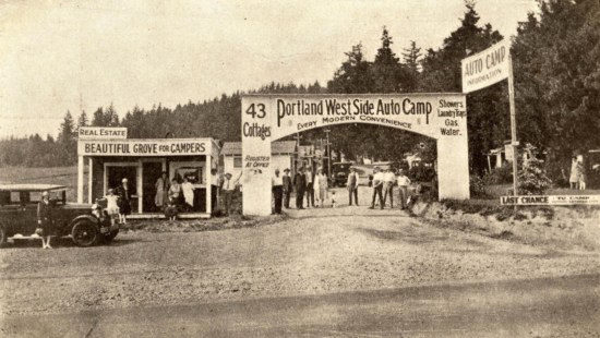Tourist parks or auto camps were not that uncommon here in Portland and elsewhere. The car was a new toy and tool, and as people traveled the countryside, they needed a place to land temporarily as they explored the area. Think of a KOA campground. Let’s just say that auto camps were in the public consciousness of the day: an enjoyable, convenient and necessary extension of car travel. Here’s a photo from the City of Portland Archives showing one such camp in 1925, somewhere on the Westside.