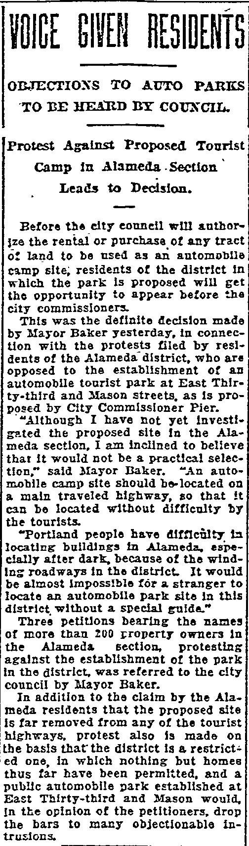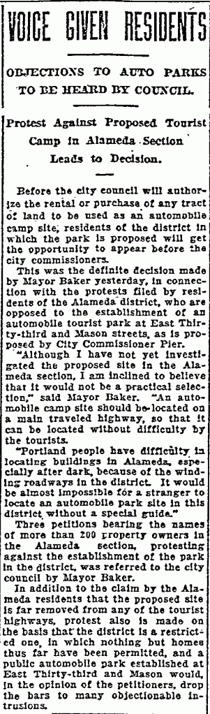But after reading the September 12th story, it took Alameda residents only a matter of hours to get up a protest to Commissioner Pier, which eventually turned into a petition drive and then a forceful meeting with Mayor Baker and City Council. In The Oregonian story from October 7, 1920 below, be sure to have a look at the fourth paragraph and its description of Alameda as a “quiet, refined district, composed of a home loving people…”