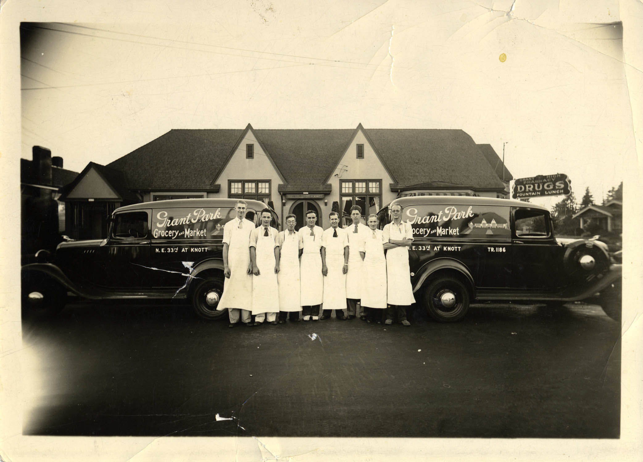 Grant Park Grocery and Market (shown at the top of this post) on the southwest corner of 33rd and Knott (2647 NE 33rd), built in 1925. This attractive grocery, now a medical office, had sleek-looking panel vans and a staff of white-aproned help who would deliver your phoned-in order to your door. Here’s a link to another photo taken on the same day, and some further information about the store.