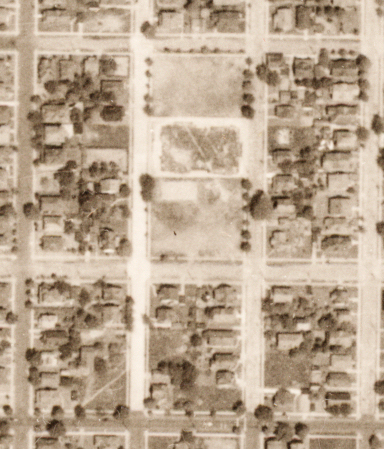 Detail of an aerial photo from 1936 showing vacant Block 54 and the burn scar / footprint of old Vernon School. NE Prescott runs east-west along the bottom of the frame.