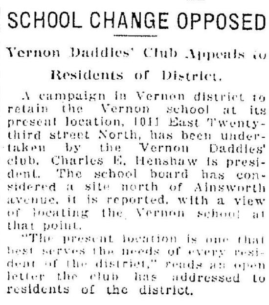 Disastrous school building fires in other cities had galvanized the national building codes community—and Portland Mayor Harry Lane—into calling for “fireproof” buildings. Code changes were made: away from wood frame to concrete, steel and brick, and lowering the profile from multi-story to one or two stories. In 1926, some school board members proposed abandoning the existing building and locating a new Vernon School close to Alberta Park, an idea that didn’t go over well in the community. An article in the April 14, 1926 edition of The Oregonian chronicles opposition from the Vernon Daddies’ Club, a position they developed and had approved at a school-wide parent meeting: