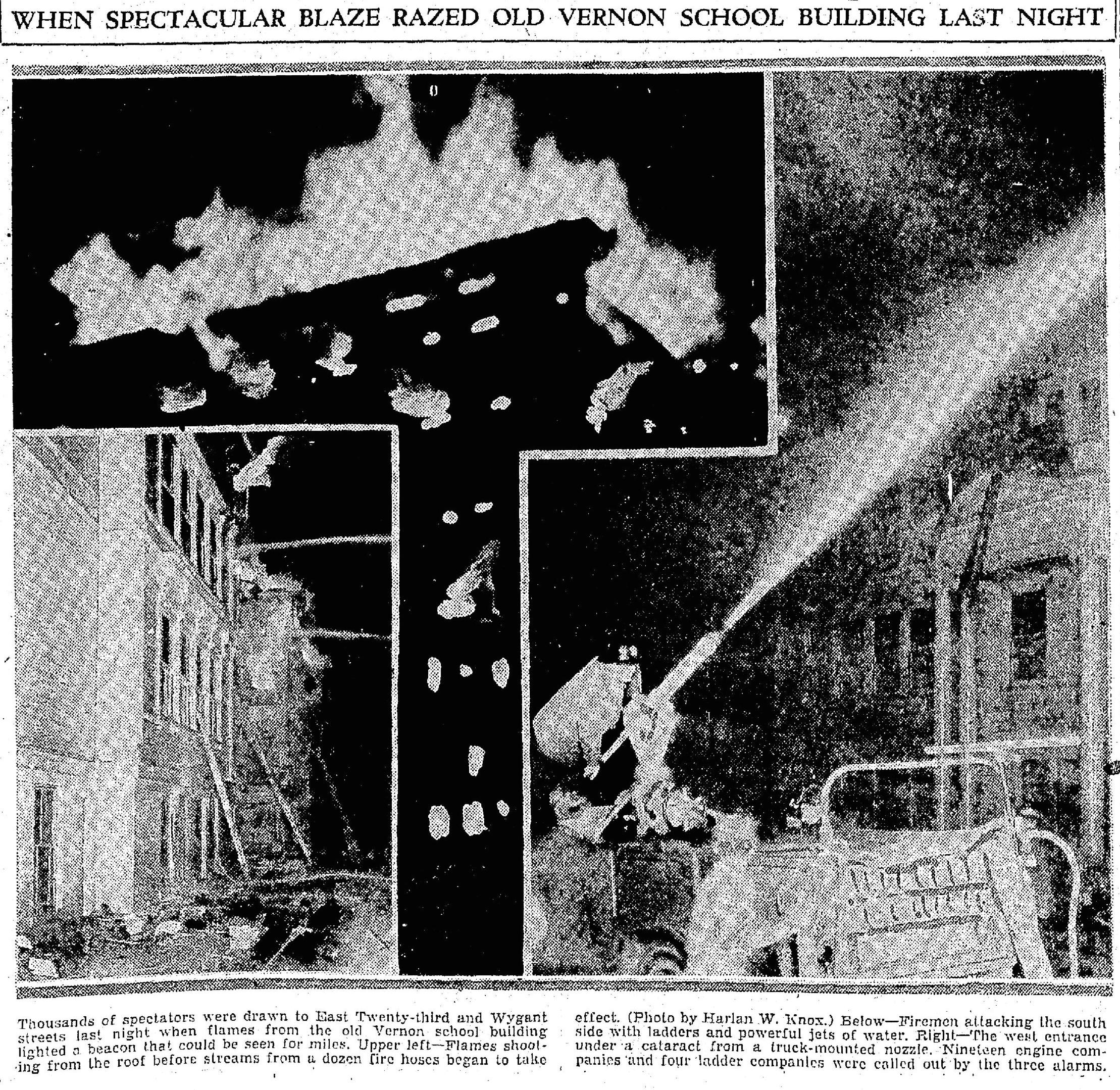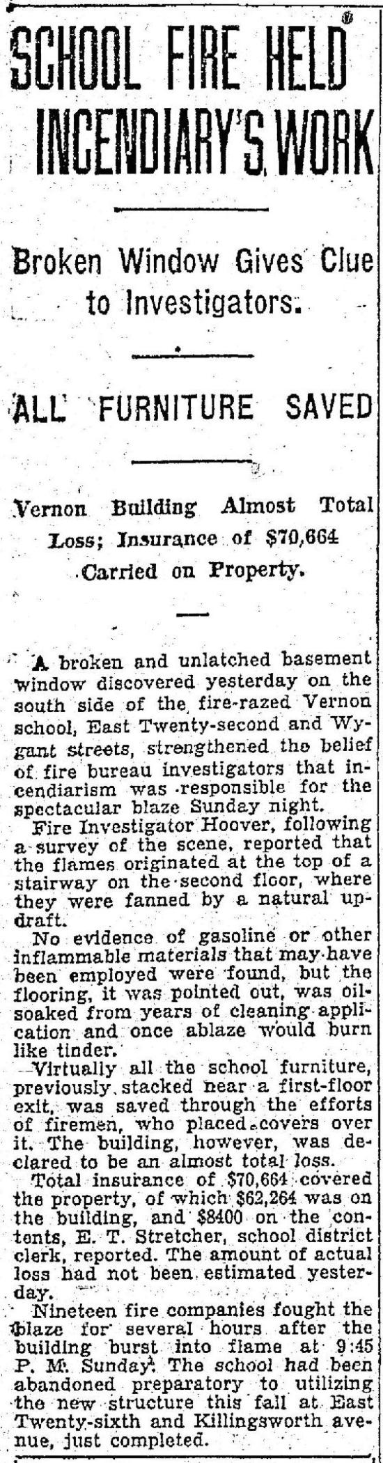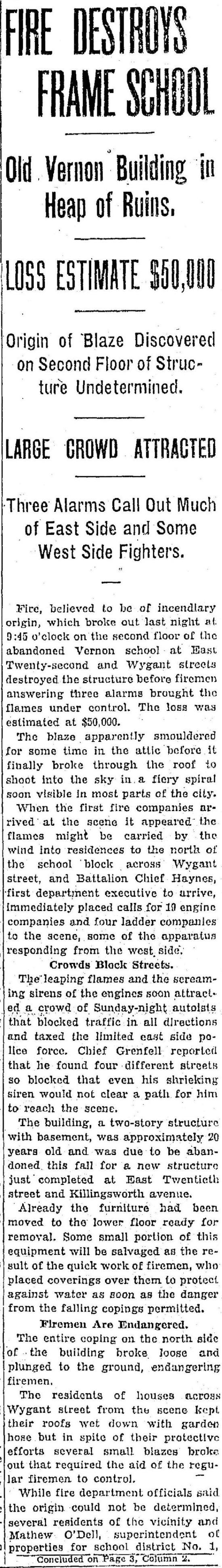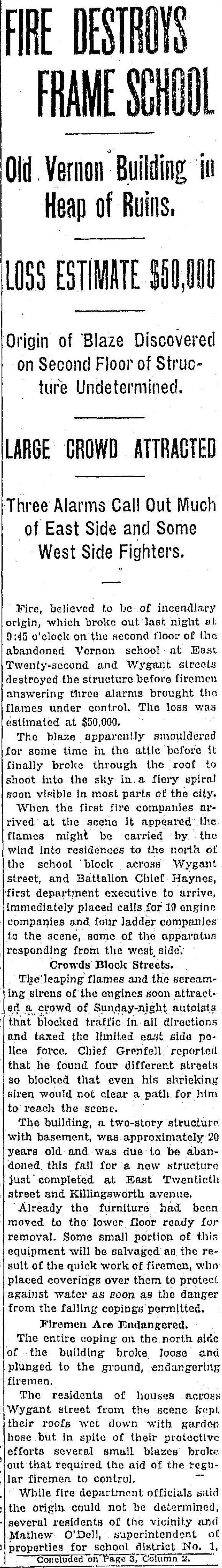 Just after dark on Sunday, August 14, 1932, someone broke the glass in a basement door and let themselves into Old Vernon, ascended the stairs to the second floor, and set a fast-moving fire that lit up the night sky for miles. The three-alarm fire drew thouands of spectators and 19 engine companies. The morning newspaper was delayed to include the news. The Oregonian was swamped with calls resulting in an explanation for the delivery delay in a prominent boxed message on the paper’s front-page masthead: “Pardon Us – But our telephone exchange was swamped when the Vernon School burned.”