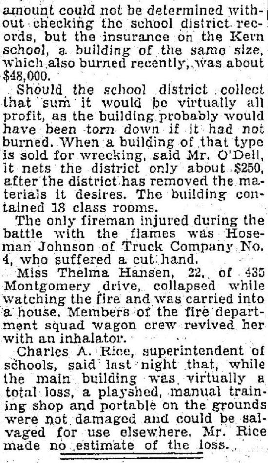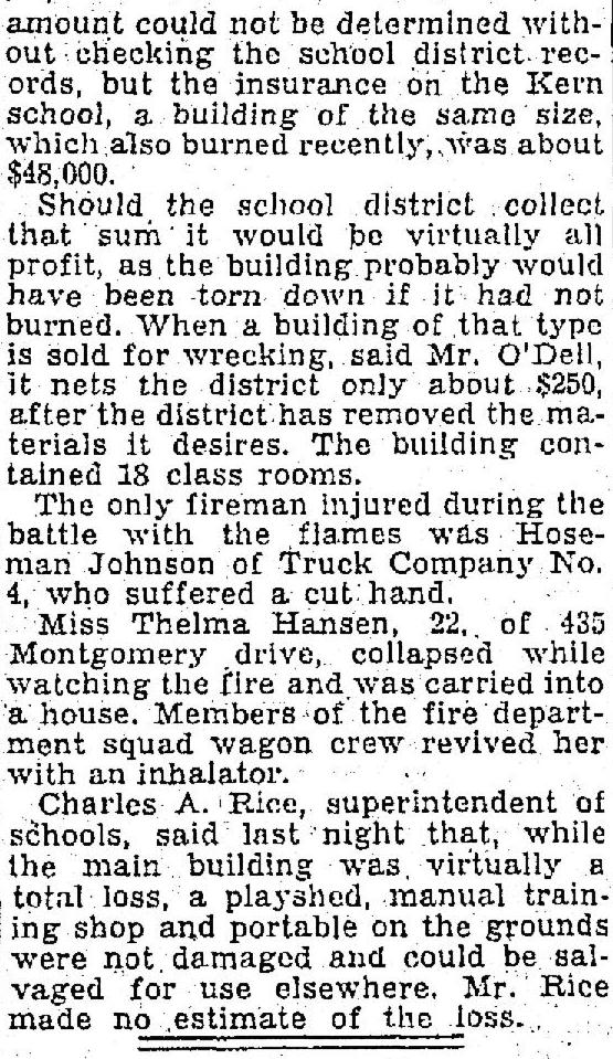 A year-long battle with the insurance company followed while the burned hulk of the building sat untouched. Originally insured for $70,000, the insurance settlement paid only $31,039.41 with underwriters arguing the building had been abandoned and that arson changed the equation. In March 1933, the board let a contract to Rose City Wrecking for $100 to demolish and haul off the remains, though the manual training building and the portable were salvaged and removed. The site was cleared by June 1933. Construction of new homes on the site began in October 1940.