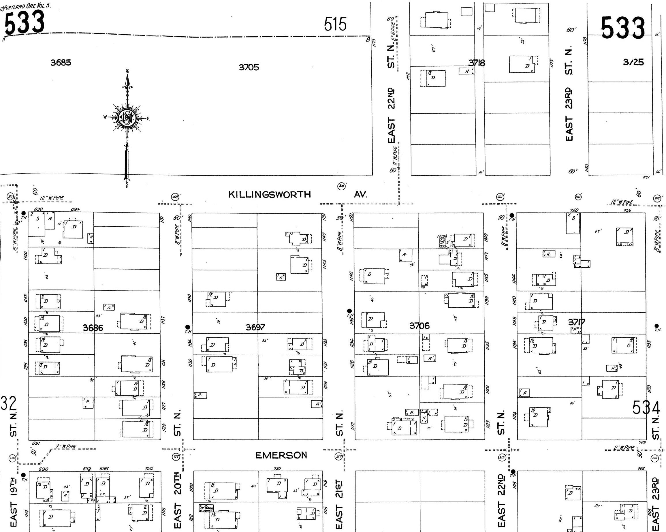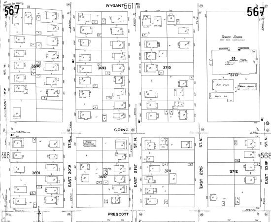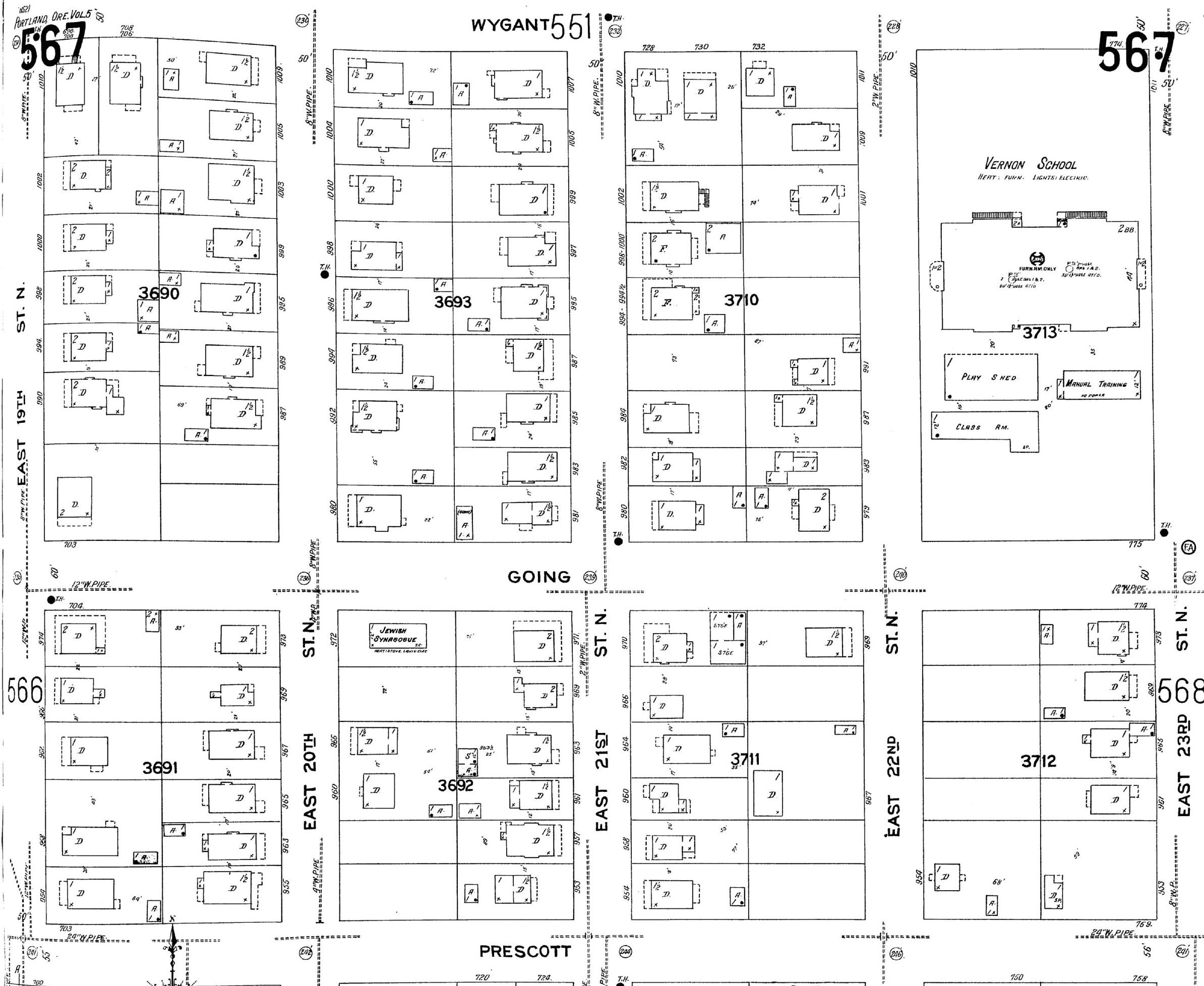 Sanborn panel 533 from 1924 shows the area of today’s Vernon School prior to acquisition by the Portland School District. Today’s Vernon occupies the two blocks between 20th and 22nd, bounded by Emerson and Killingsworth. The large empty block at the top left is Alberta Park. Click on image for a larger view.