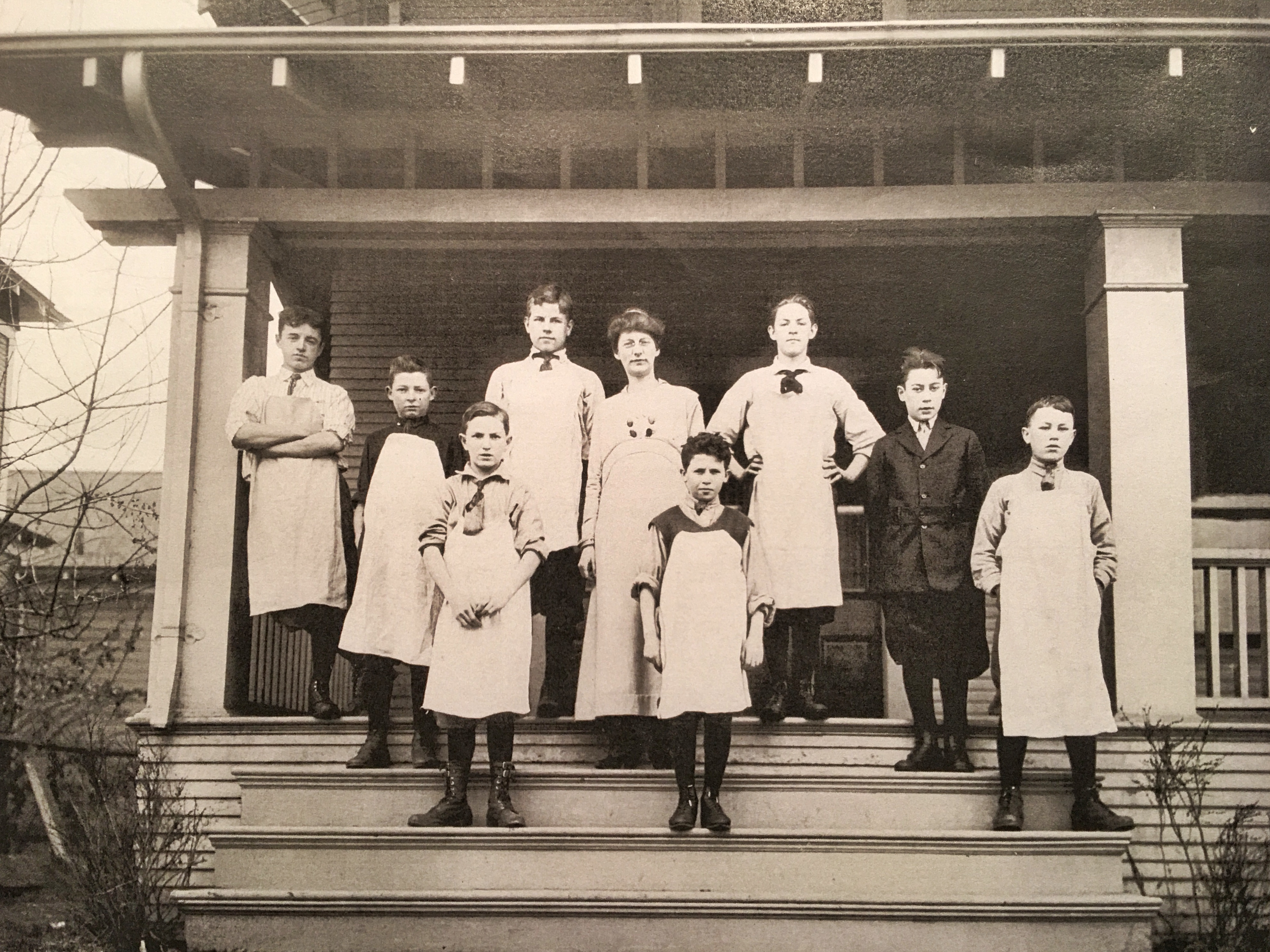Scattered and unidentified in File 1856 at the Oregon Historical Society are pictures of young people preparing food in an old house kitchen and lined up on a front porch looking very determined in their white aprons.