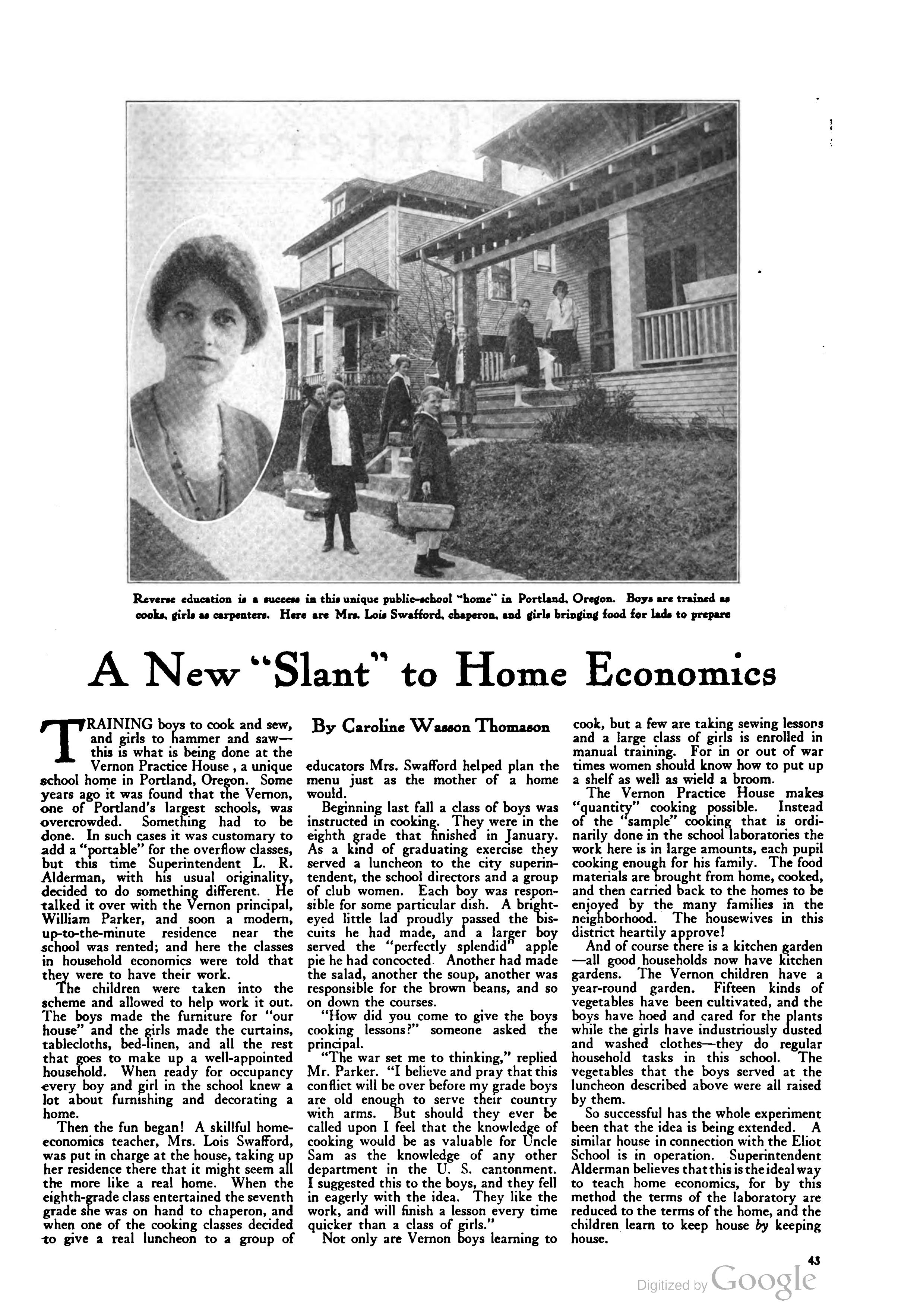 Below, an article from Sunset Magazine in October 1918 tells pretty much the same story of the program. Featured in the photo is the Vernon Practice House (the second of the two houses) at NE 21st and Going, which operated after 1917 under the leadership of Mrs. Lois Swafford (inset). Click the image below to enlarge.