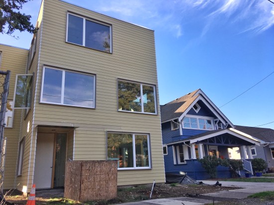 New construction built in the footprint of residential tear-downs or lot conversions has been shockingly insensitive and out of scale to its neighbors. Just look at this charm-free apartment-block-like building now almost completed in the middle of a residential Beaumont neighborhood. Would you like to live next to that?
