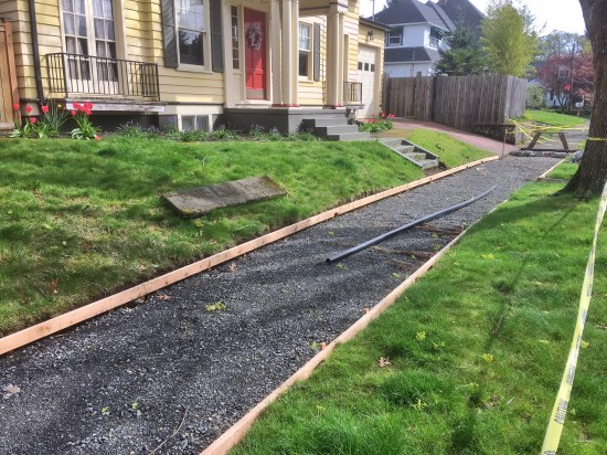 A couple weeks back, we noted the current safety-minded owner had quite reasonably pulled out the entire sidewalk and formed up for a new one. When we saw the pile of rubble left over from the broken pieces, we figured that was the end of Josie’s concrete. Hey, this was only a sidewalk, and it was a serious tripping hazard that needed to be replaced. Sorry Josie, but it was time.