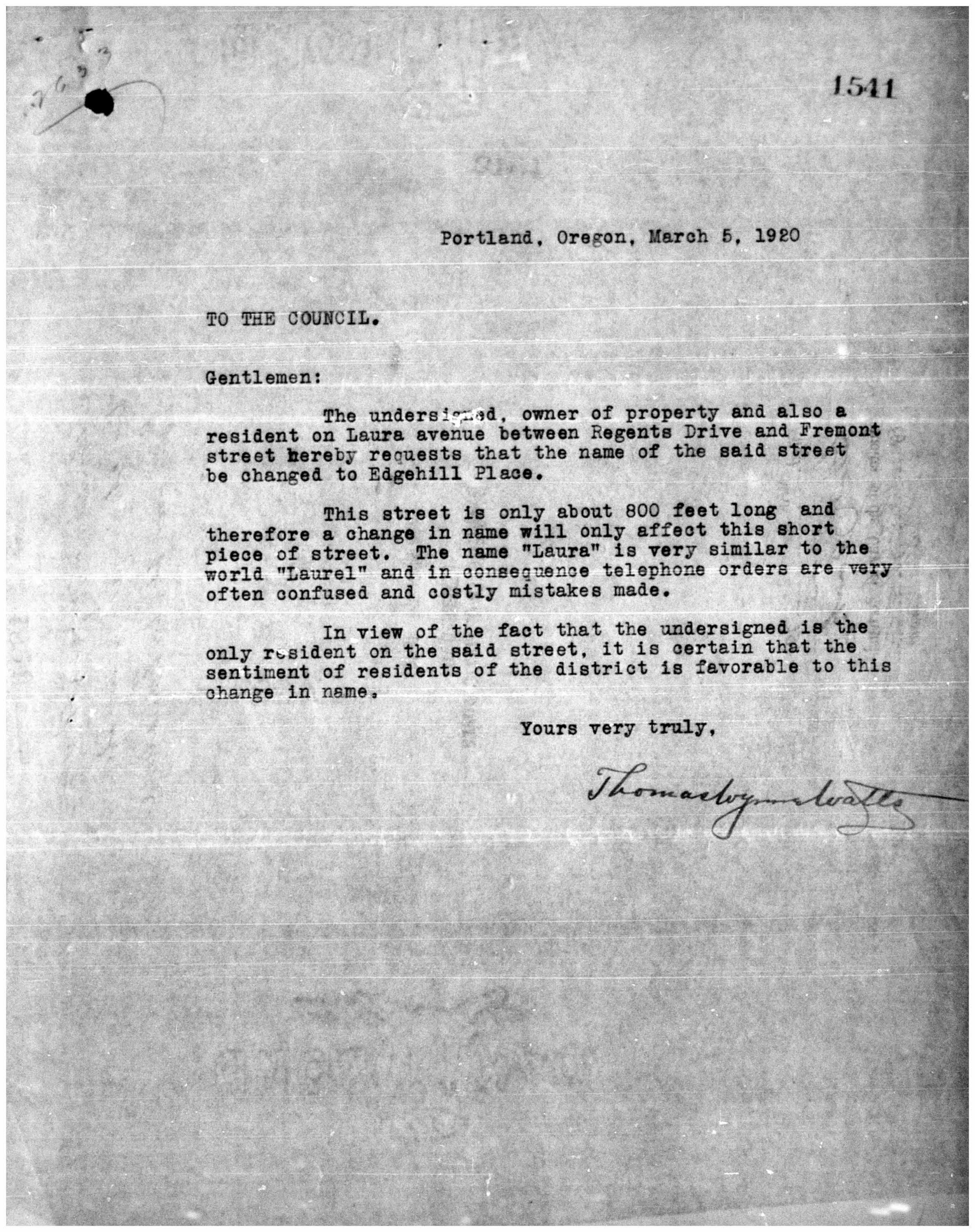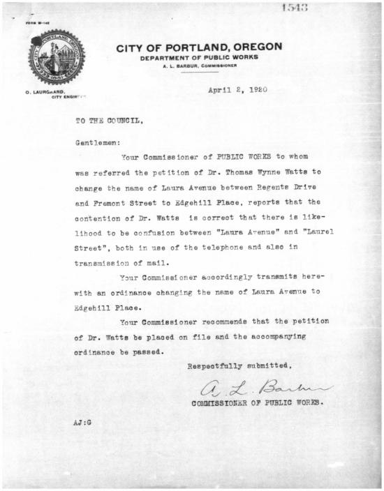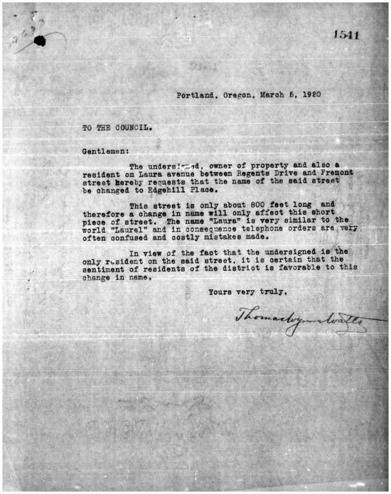 That trail led us to the City of Portland Archives and Record Center, which is a good place to find yourself if you’re out of living answers. The Oregonian reported that a petition had been raised in protest by residents of Laura Avenue, so we launched into microfilm of Public Works Department records from March and April 1920, and sure enough, there it was: a letter from Dr. Thomas Wynne Watts, resident of 874 Laura Avenue, today’s 2840 Edgehill Place (remember, Portland’s streets were renumbered in the early 1930s).