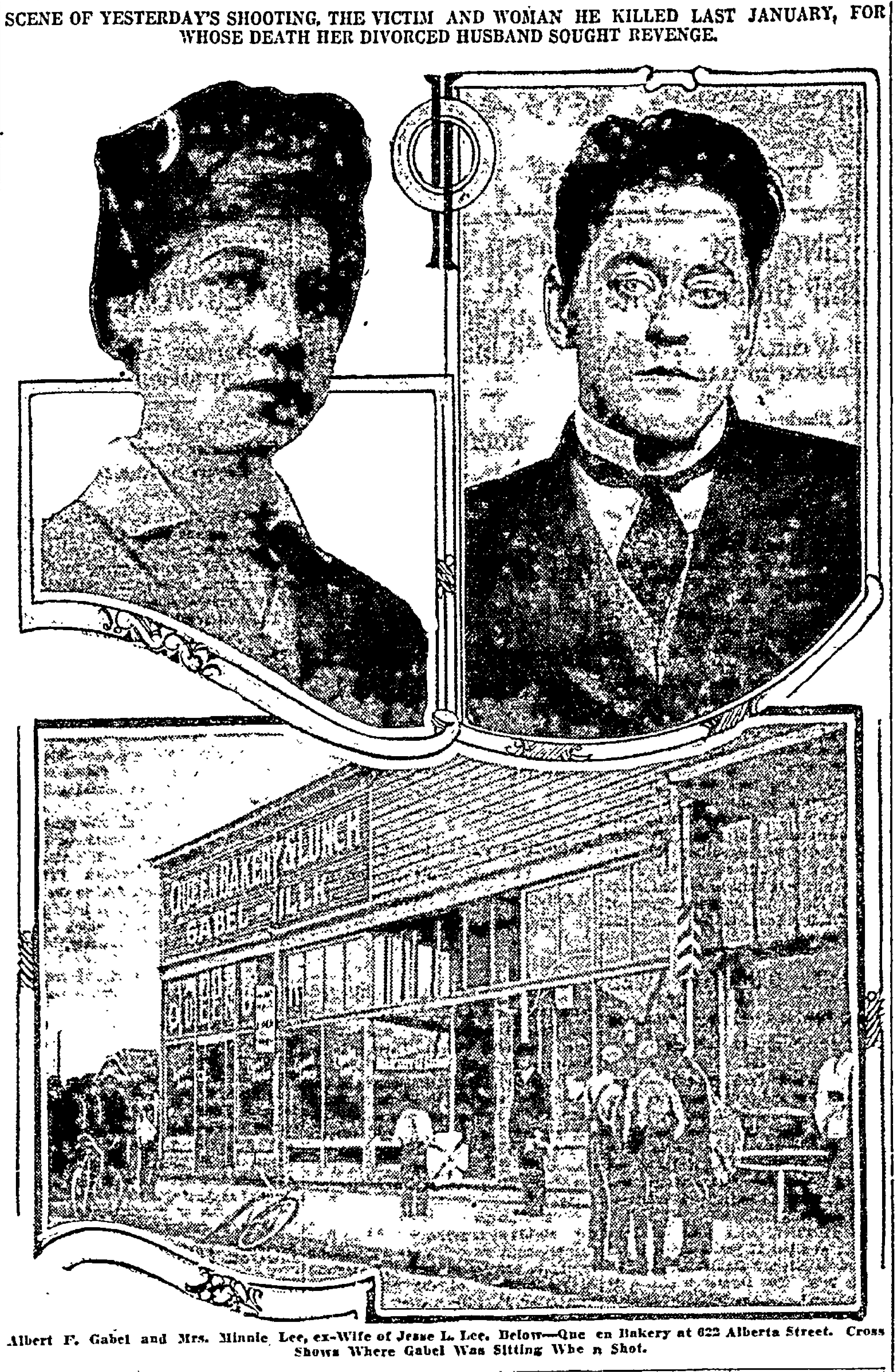 In September 1916, Minnie’s widowed husband Jesse L. Lee, who had been living temporarily in Canada, came to Portland to settle the score, tracking down Albert on the afternoon of September 14th where he was sitting on the front steps of the Queen reading a newspaper and waiting for his next delivery. Jesse Lee walked up, asked Albert “Do you know who I am? Well, I’m Mr. Lee,” then fired two blasts from a sawed-off 12-gauge shotgun directly at Albert. The blasts hit Albert in the arm and shoulder, shattered the glass at the bakery, wounded a nearby schoolboy, and terrorized all of Alberta Street. Lee surrendered moments later without incident in a vacant lot at 15th and Wygant, pleased with himself for finally avenging his wife’s death, but disappointed to learn hear he hadn’t killed Albert Gabel.