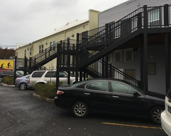 Behind 1726 NE Alberta, about the same view as the early Gabel & Son Bakery delivery wagon photo. November 2018.
