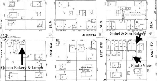 Albert drove a bakery delivery wagon for his father and his brother Henry, perhaps the wagon pictured here. In January 1916 Albert, then age 24, was involved in what investigators determined was an accidental shooting of his girlfriend, Minnie Lee. It’s a long, sad story that we won’t go into except to say that Albert had become obsessed with Minnie—who at that time was separated from her husband. During what Albert described as horseplay, a rifle discharged, the bullet striking and killing Minnie. Initial news reports (and Minnie’s family) called it murder, but the DA backed off to a charge of involuntary manslaughter on the basis of evidence, and Albert was set free on bond to await trial and went back to driving the bakery delivery wagon. By 1916, brother Henry had opened Queen Bakery and Lunch up the street with his business partner Warner Illk, 622 East Alberta (remember, this is before the Great Renumbering). We’ve pointed out the Queen above at the far left of the Sanborn map detail.