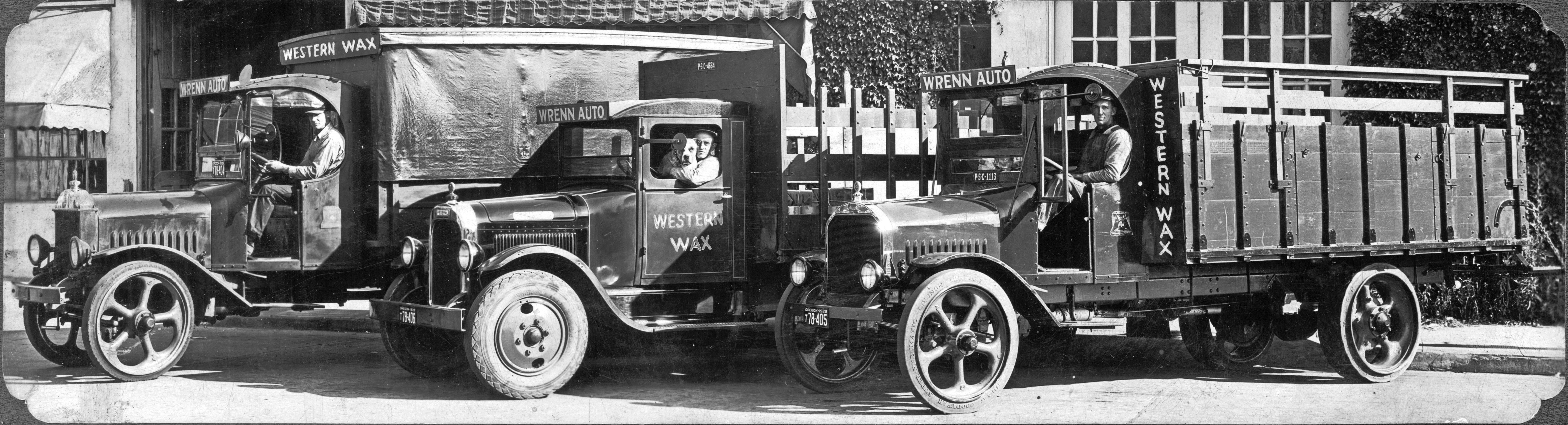 To our eye, it looks like this photo has been touched up a bit, though the sparkling chrome on the Mack truck at far right looks completely genuine. The labels “Western Wax”—referring to the Western Wax Paper Company, a major customer of Wrenn’s in 1929—have been penciled in, and the hood of the Mack on the far left looks like it’s been doctored (nice fingerprint there too, which gives us a clue about the size of the original photo). But everything else looks authentic, including the surly looking dog in the middle truck.