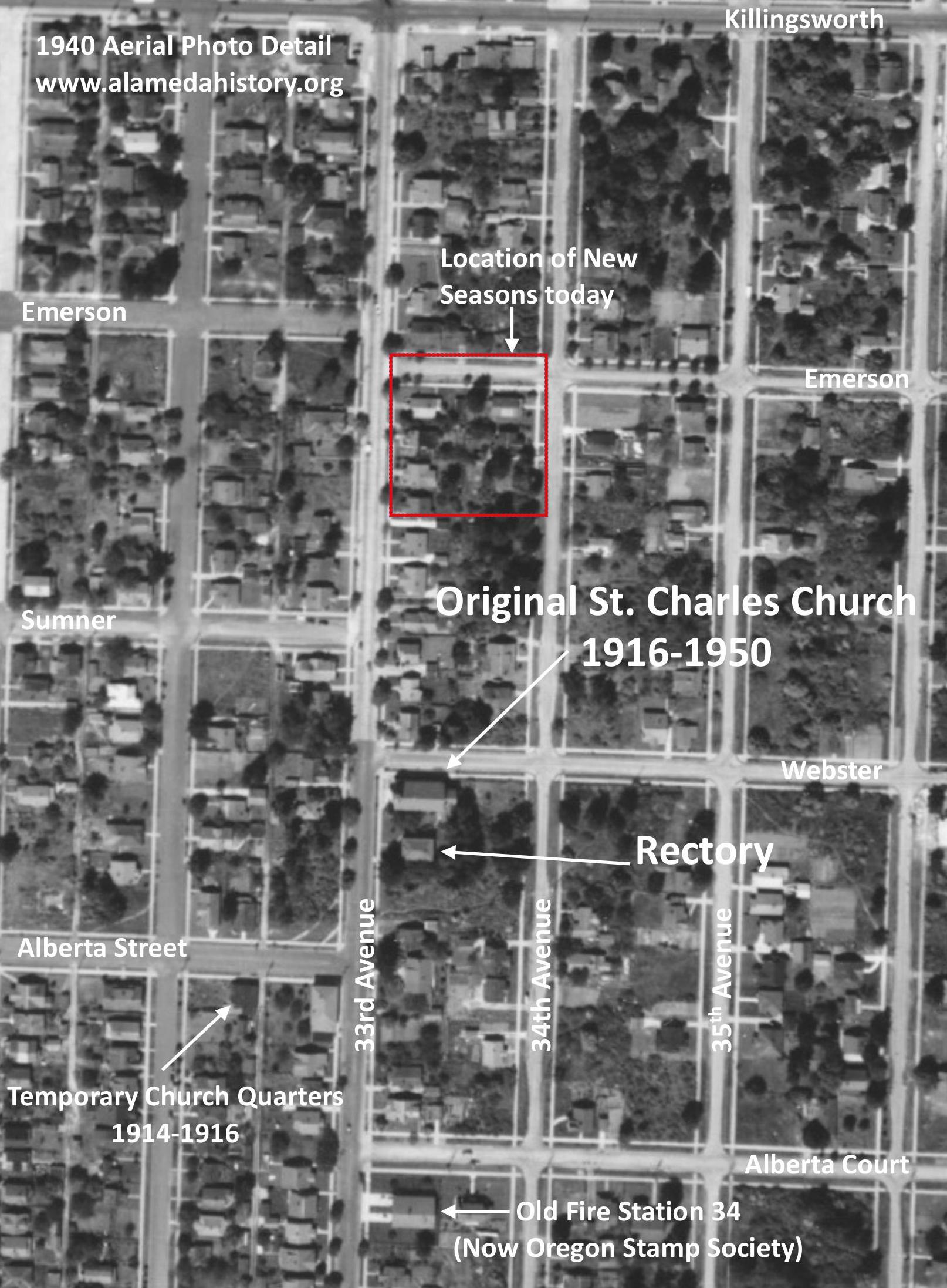 Detail of 1940 aerial photo showing location of original St. Charles Church at the southeast corner of NE 33rd Avenue and Webster Street. Photo courtesy of University of Oregon Map and Aerial Photography Library.