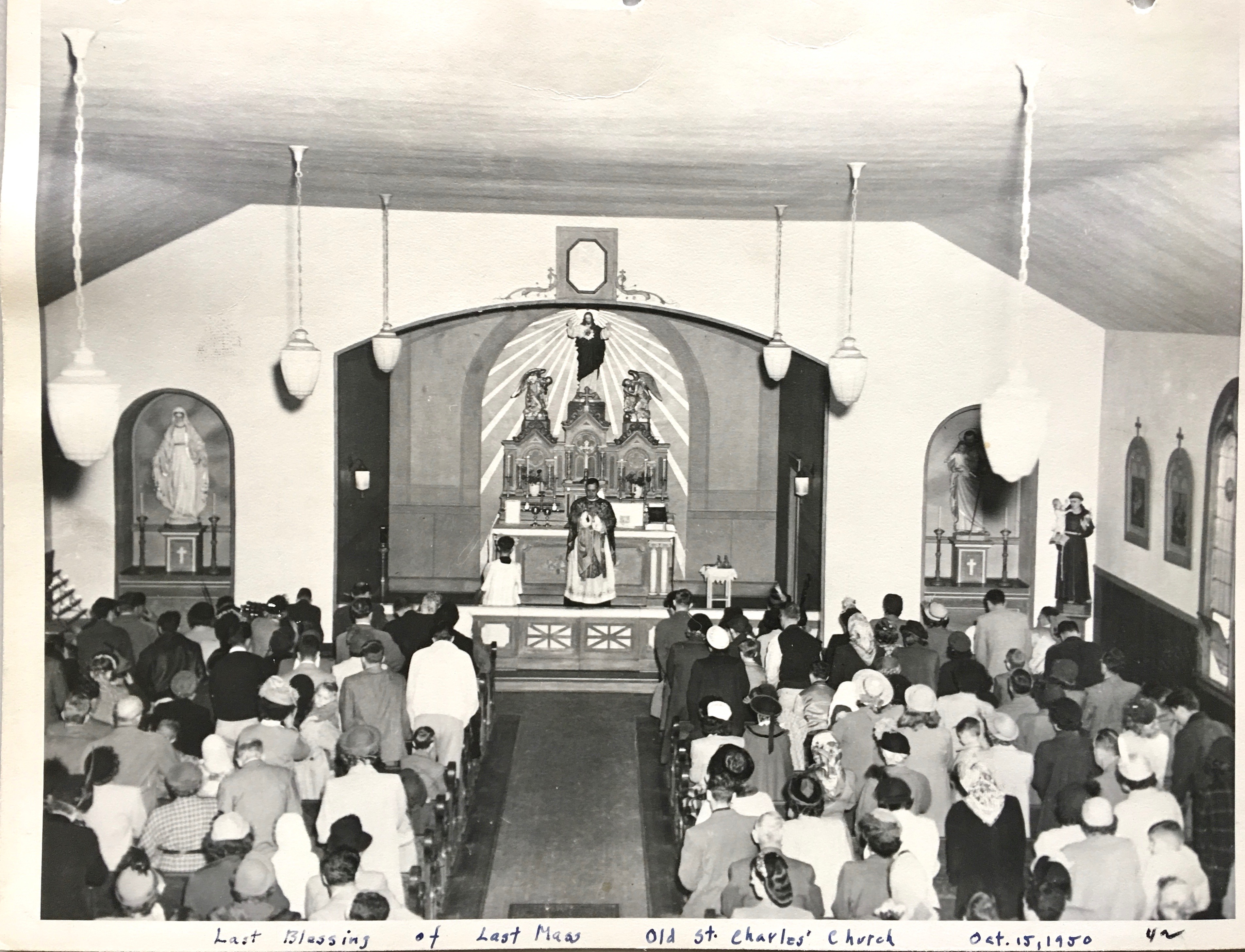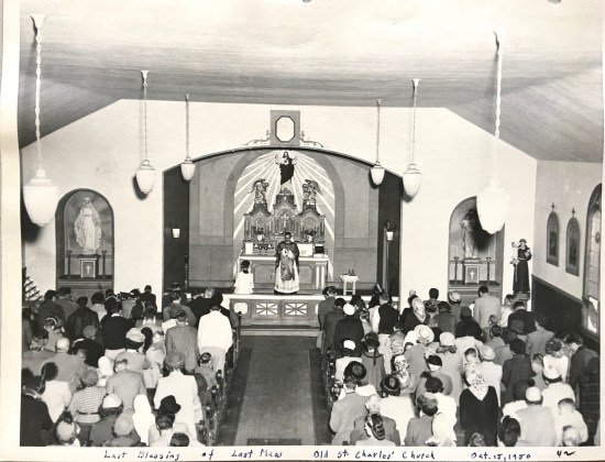 The final mass at the old church was held on October 15, 1950. A photograph was taken from the church balcony to document the end of an era. And on October 22, the new St. Charles was dedicated with mass held in temporary quarters on the new site until the new church building could be completed in 1954.