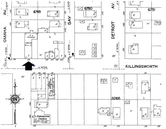 Detail from Sanborn Plate 521 shows the area in 1924. Arrow indicates location of Ockley Green Groceries and Meat.
