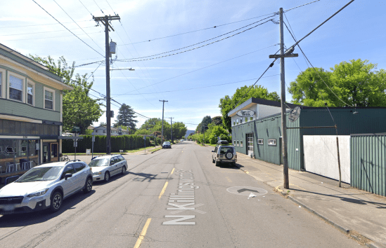 As the writing on the wagon to the left says (and the numbers on the window to the left of the front door suggest), this is 155 Killingsworth Avenue, which before Portland’s Great Renumbering was actually 155 West Killingsworth. When you map that out today, it takes you to 2225 N. Killingsworth, located on the north side of the street just east of the N. Omaha Tree Way, a four-block-long Arbor Lodge boulevard.