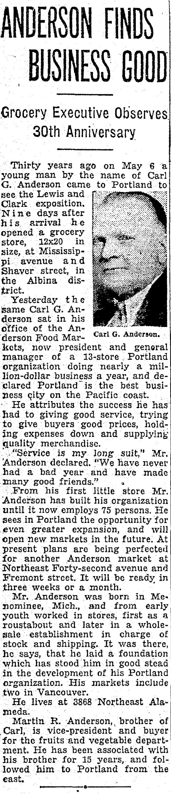 Grocer Carl Anderson was a bit of an empire builder, and definitely thought of himself that way. This business profile, written not long after the photograph was taken, provides further insight into Anderson’s humble beginnings and rise to grocery stardom.