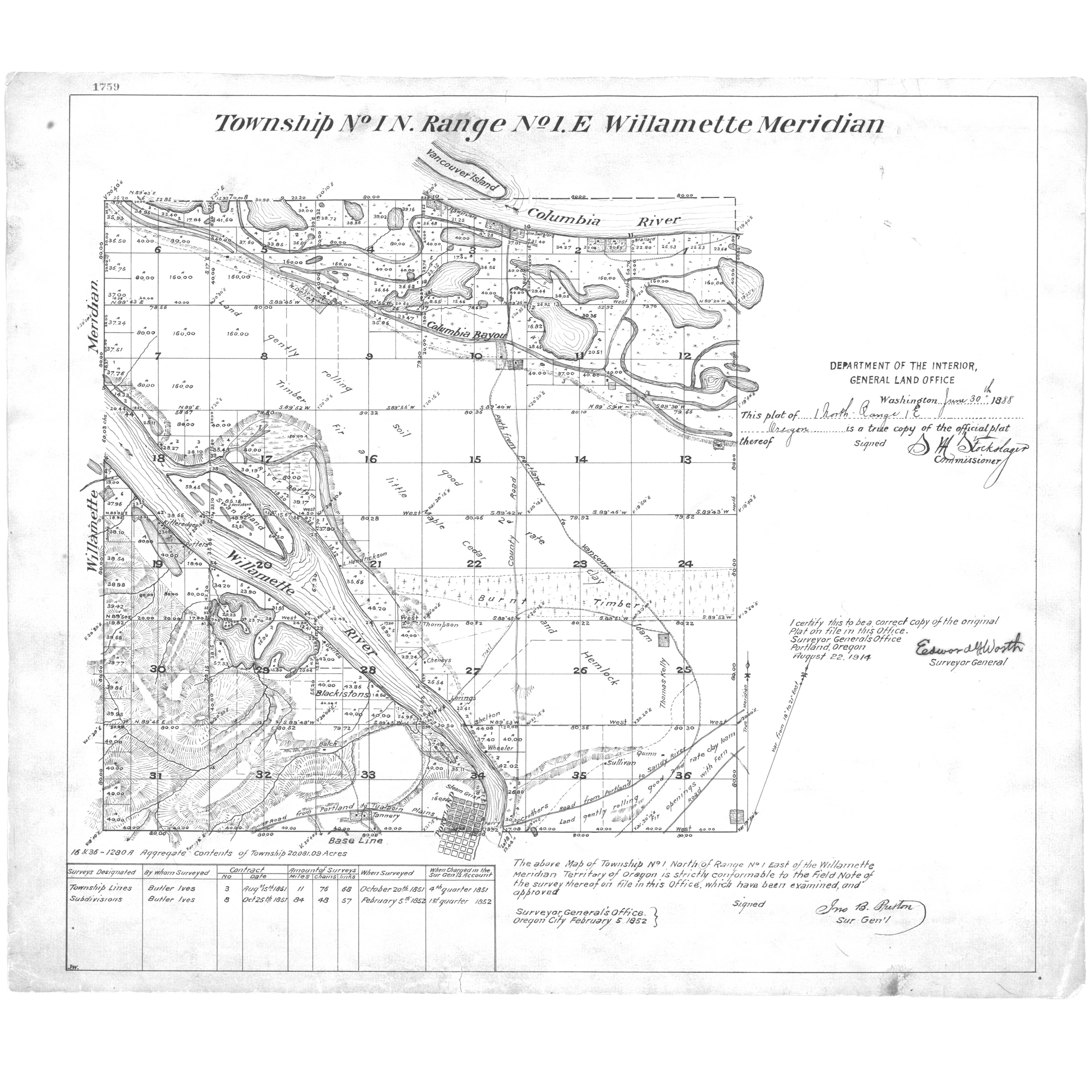Detail of 1852 Map of Township 1 North, Range 1 East, Courtesy of Bureau of Land Management Cadastral Survey Records. The complete map plate is here in our Maps collection.