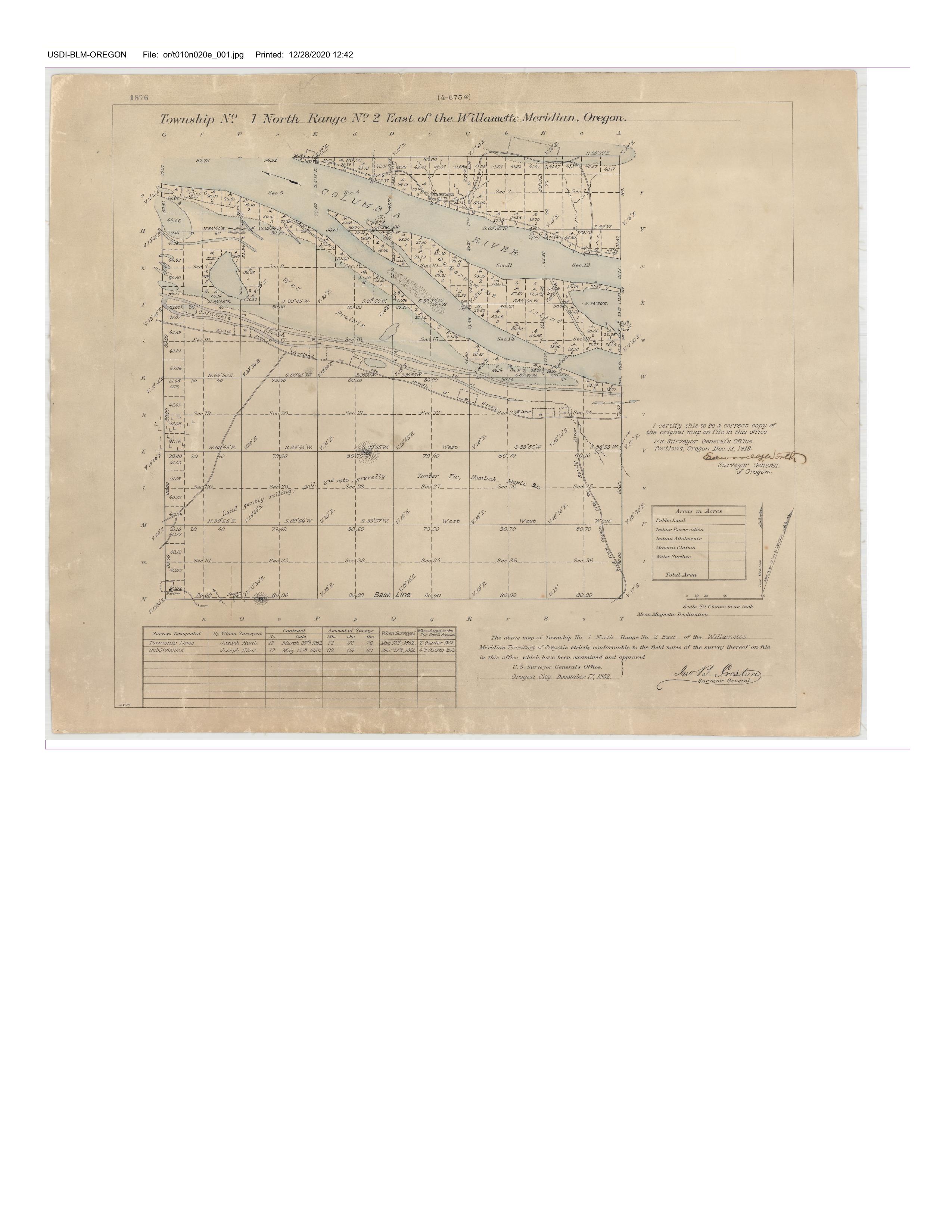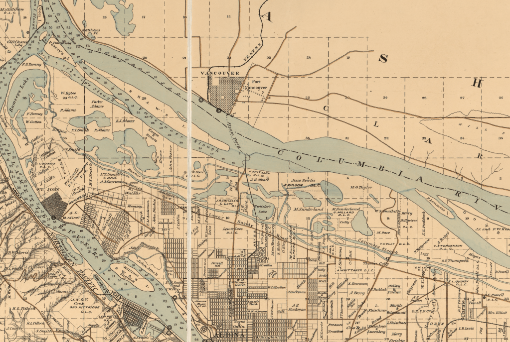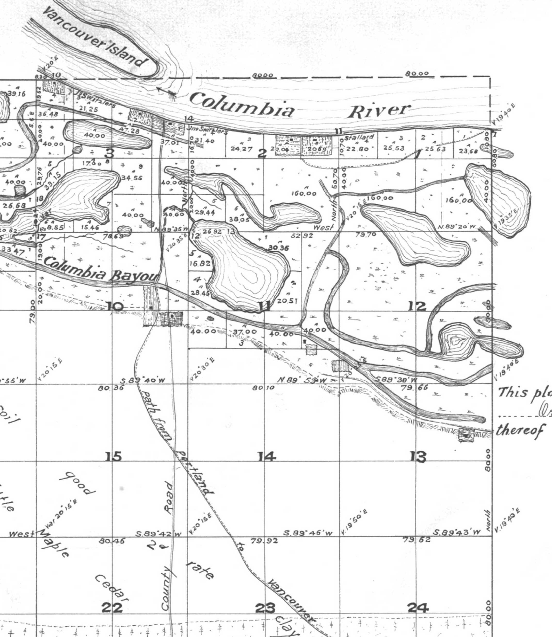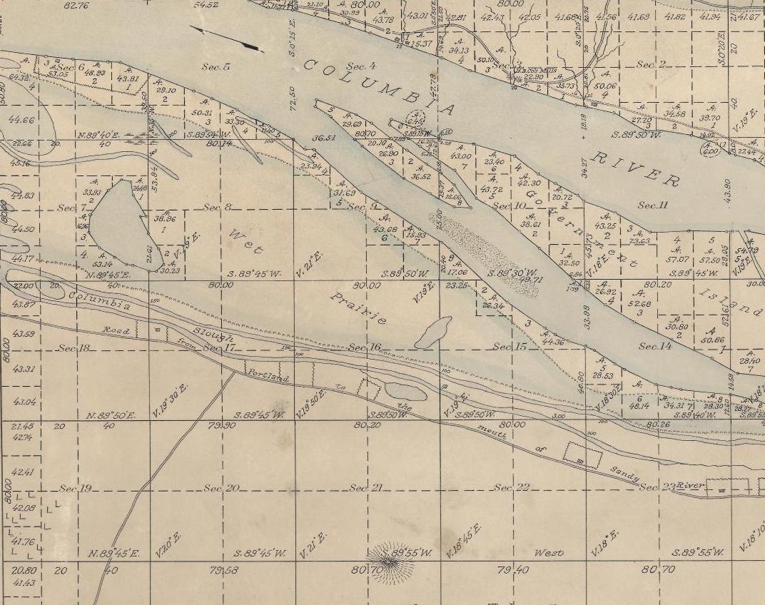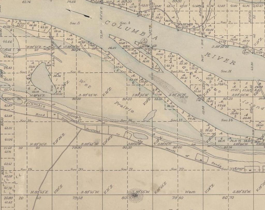 The island labeled “Vancouver Island” is today’s Hayden Island. For orientation purposes the number 24 (which is Section 24 in Township 1 North, Range 1 East) is at the intersection of NE 33rd and Prescott Street. The far right edge of this map running up and down follows the line of today’s NE 42nd Avenue.