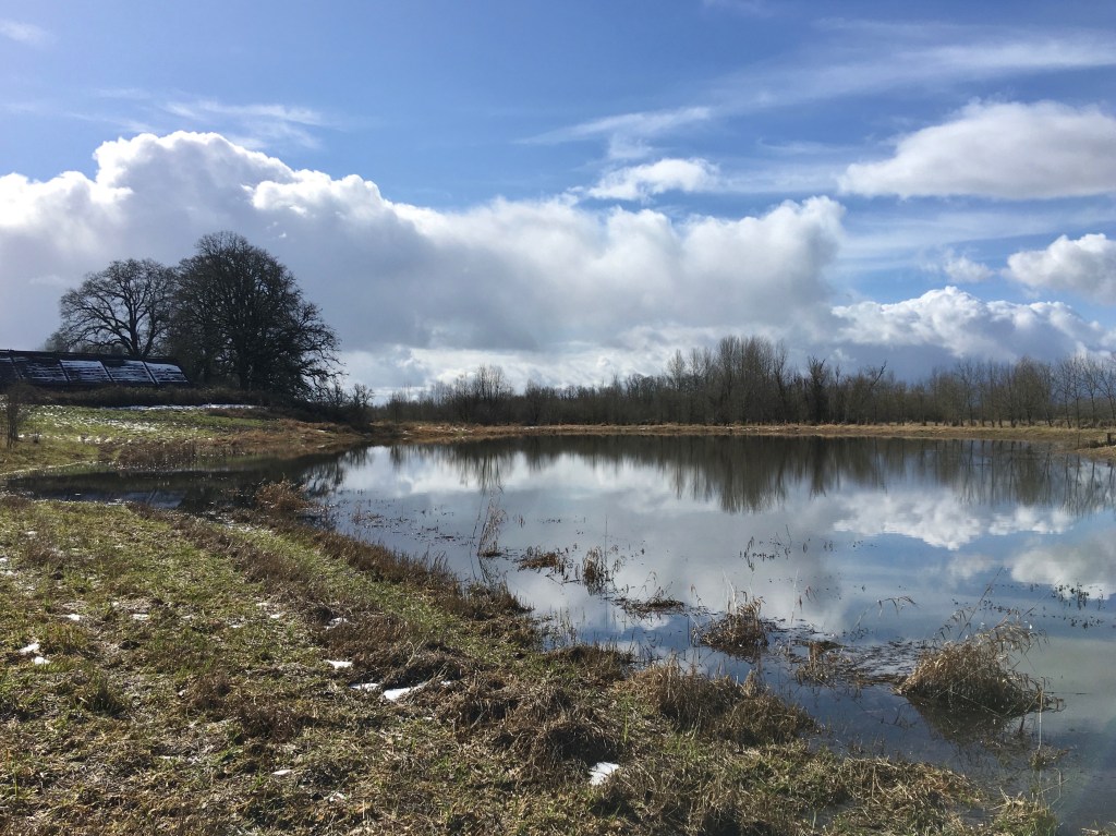 Imagining a “wet prairie.” That’s the reconstructed Cathlapotle plankhouse on the left at Ridgefield National Wildlife Refuge. February 2021