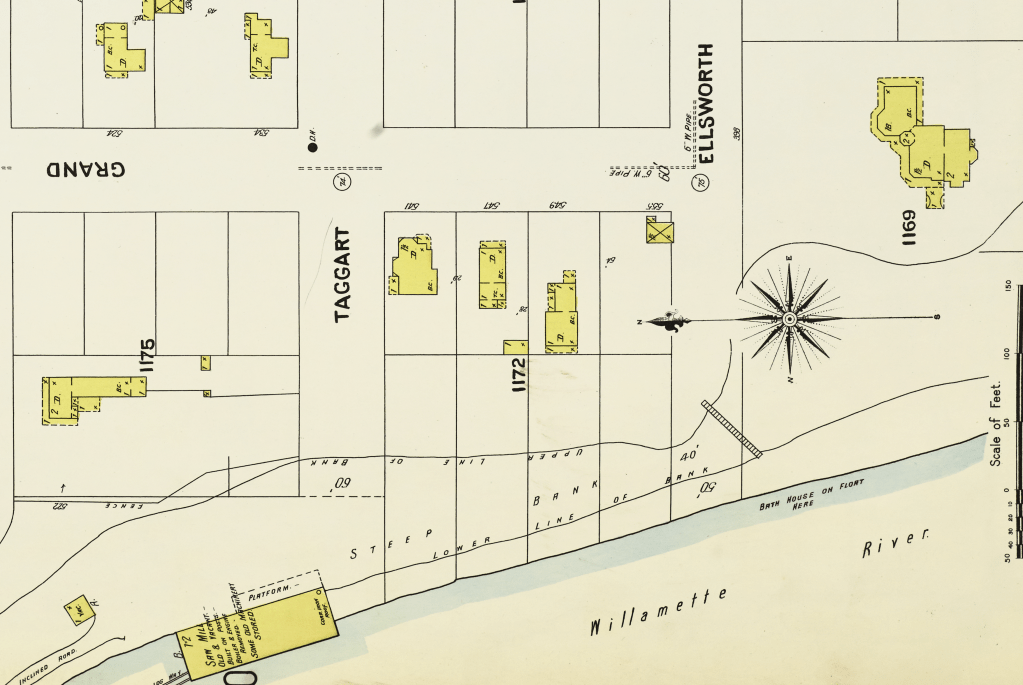 If we could zoom out a bit on this Sanborn plate and look to the north, you would see all of the other east-west streets in the area—Grant, Sherman, Caruthers—essentially ended at the top of the bank (or ran into the Inman-Poulsen sawmill) where it dropped off to the river. We’d also see Stephens Slough (fed by Brooklyn Creek) which filled almost as far east as SE 10th Avenue that would flood whenever the river rose, where nothing was built, even though there were lot lines and streets.
