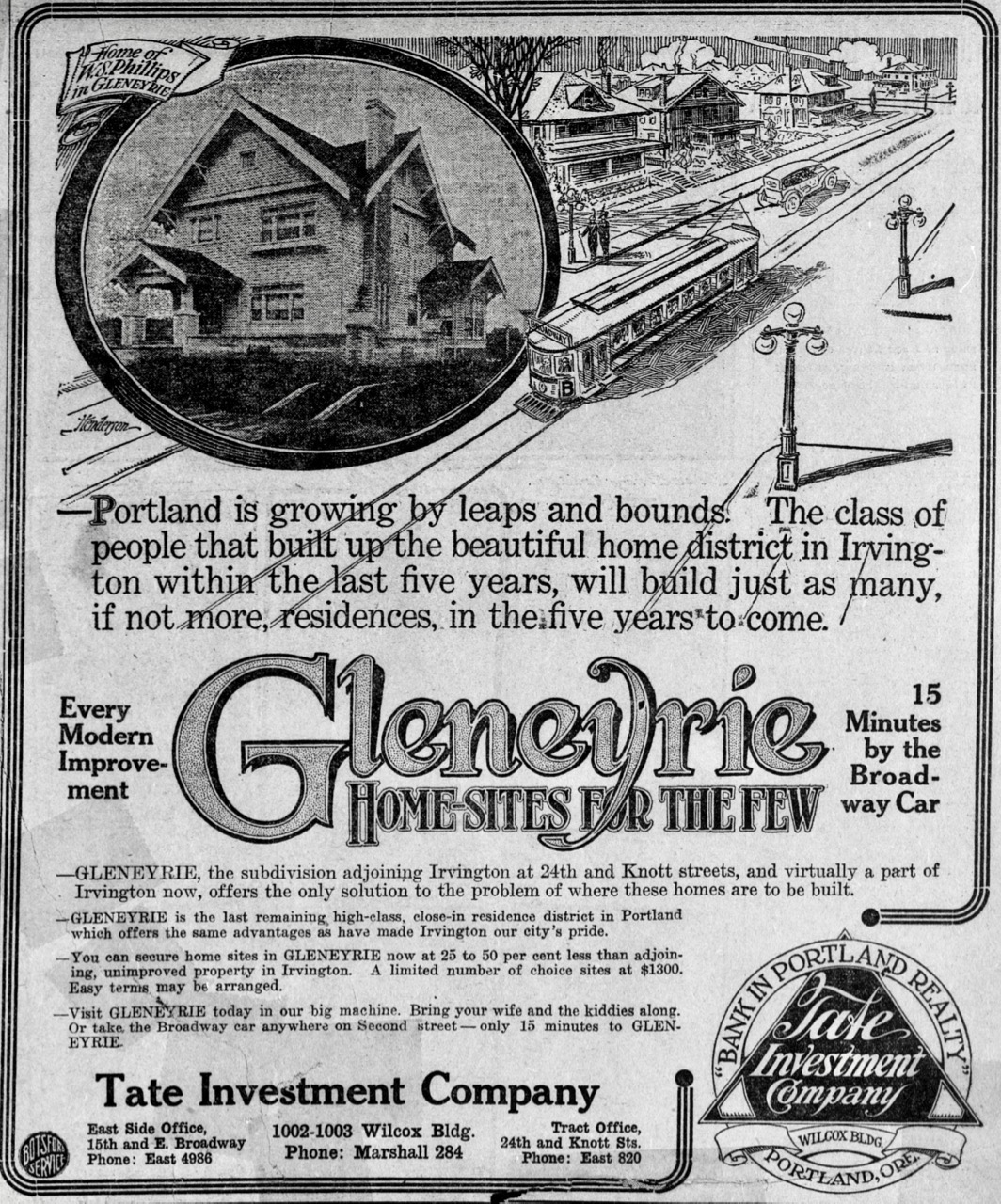 Back then when the neighborhood was just starting out, the Tate Investment Company wanted you to come see Gleneyrie. And to have a look at a big house by Arnt Anderson. Check out this ad which includes a genuine Anderson and a stylized look at NE 24th Avenue (complete with the Broadway Streetcar).