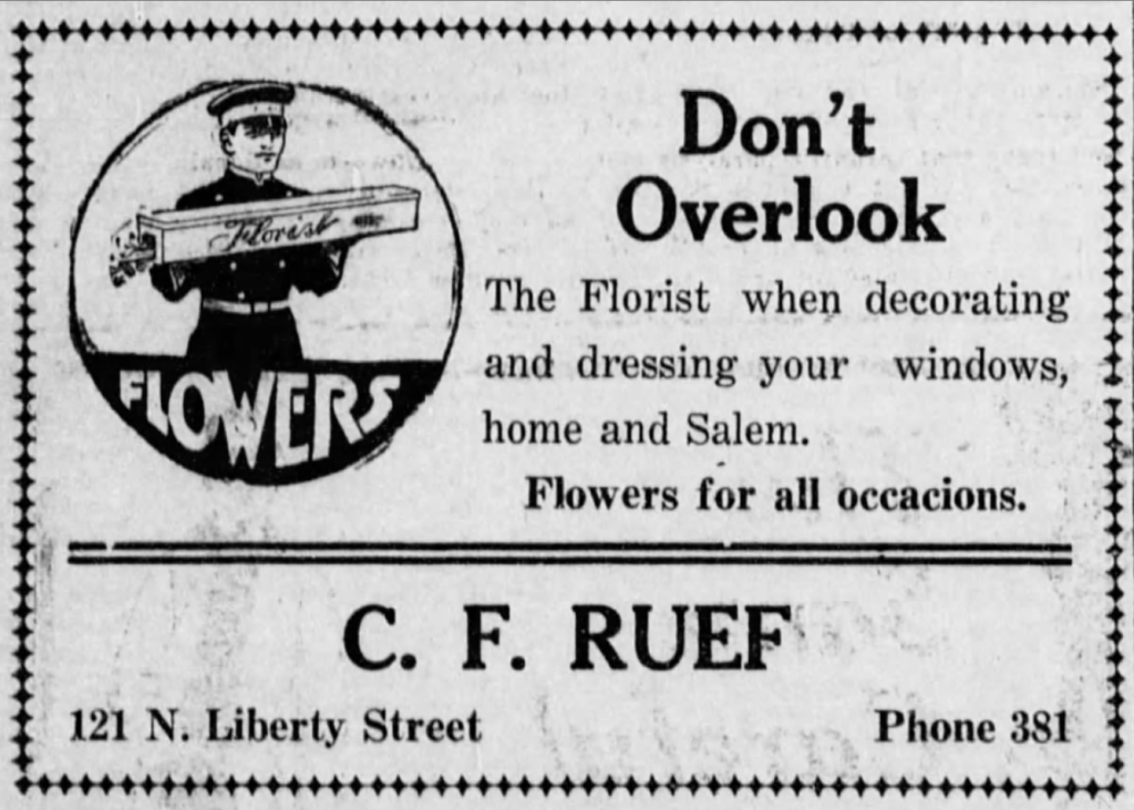 Carl F. Ruef was a first-generation American from German immigrant parents who was born in Claremont County Iowa on May 20, 1879 and grew up in Salem, Oregon. With his brother Edward, Ruef established the largest floral greenhouse operation in Oregon outside of Portland near the intersection of 17th and Market Street in Salem, with a retail storefront in downtown Salem. In the 19-teens Ruef, built a reputation as Salem’s leading florist, knowledgeable about all aspects of flower growing, gardening, and the cultivation of fruits and berries.