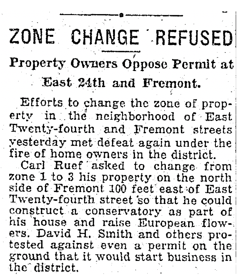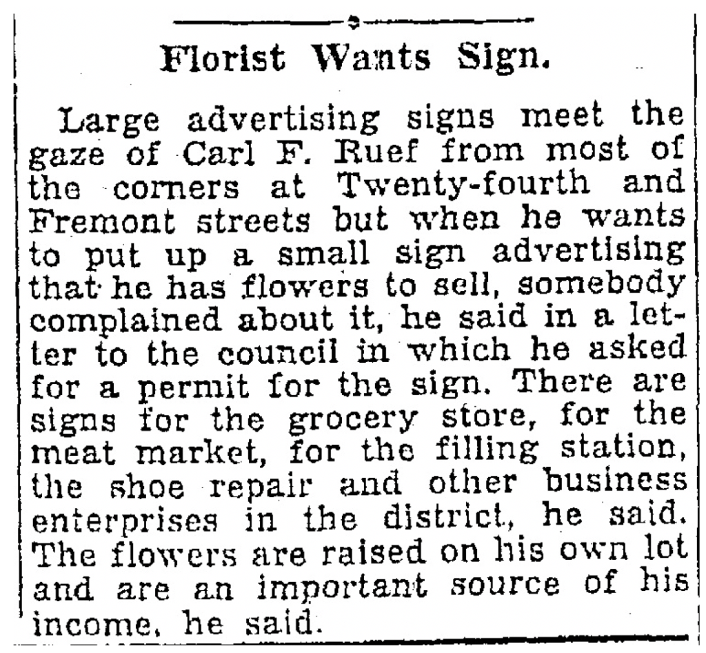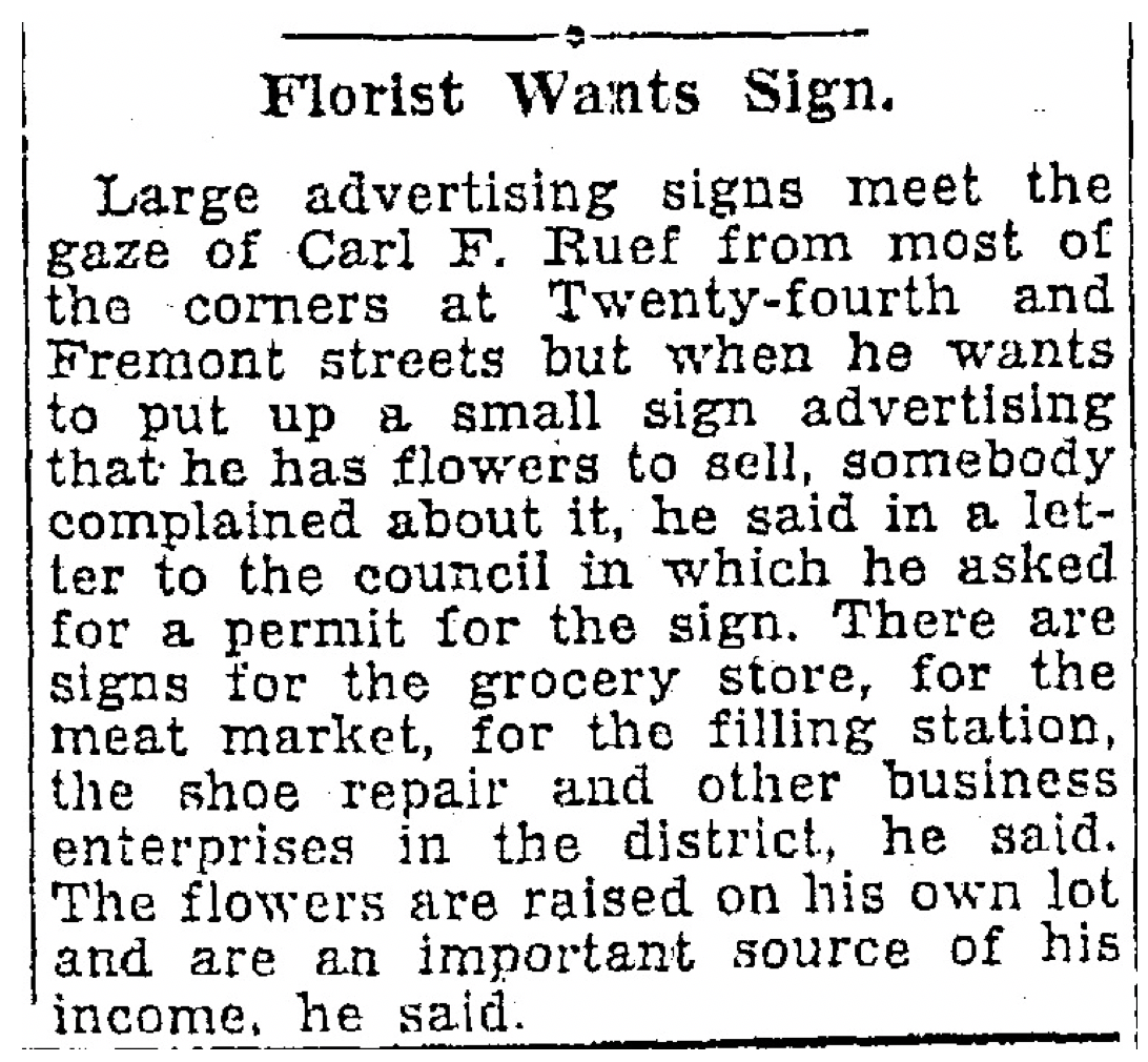 In May 1931 he requested a zone change and permission to put up a sign for his flower business facing Fremont: the lot to the west, location of today’s Childroots Daycare, was vacant during those years as was the residential lot to the east. But neighbors didn’t like the idea of businesses in the Alameda Park Addition period, stemming in part from the original deed restriction prohibiting businesses in the neighborhood, and complained to the city which in December shut down both the sign request and later the zone change which would have allowed Ruef to open a small flower shop.