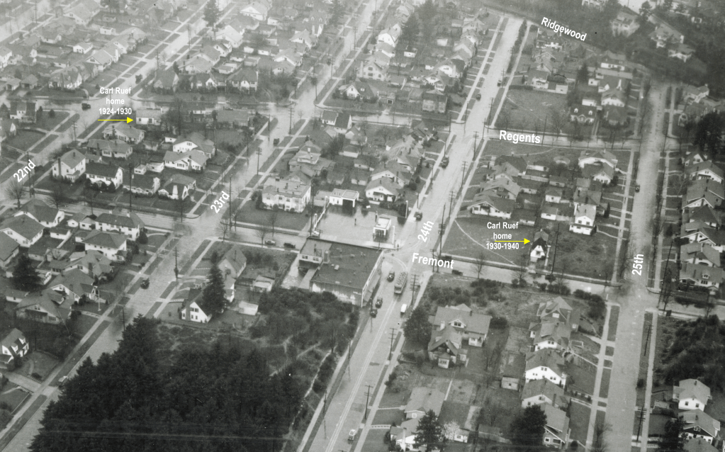 This annotated photograph from a rainy day in 1935 (click to enlarge) shows the home Ruef built at 2425 NE Fremont where he wanted to establish a flower shop, and the home he built in 1924 at 2208 NE Regents in upper left. The vacant lots either side of the Fremont house would have been perfect for the greenhouse he had in mind. Note: the Broadway Streetcar waiting at the corner of Fremont and 24th in front of the Alameda Pharmacy; the gas station on the northwest corner; and the vacant lots on both the southeast and northeast corners. Original photo courtesy of Portland City Archives, A2005-005.1421.2. For more views of this intersection, click here.