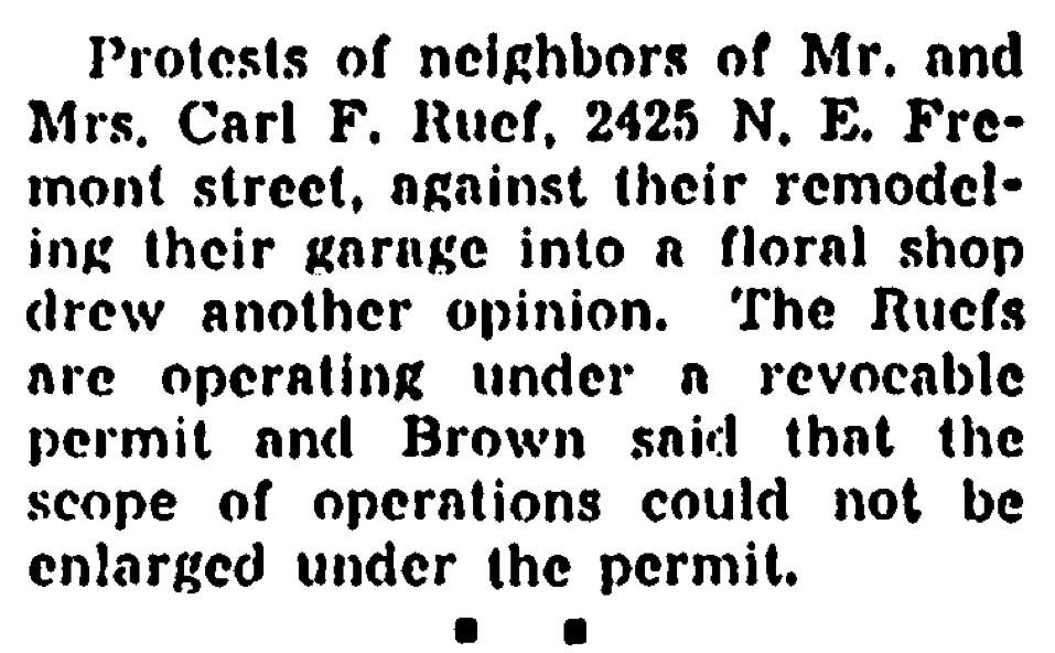 Meanwhile in the late 1920s, Ruef turned back toward the floral business, opening and then later selling the Irvington-Alameda Floral Company at 1631 NE Broadway.