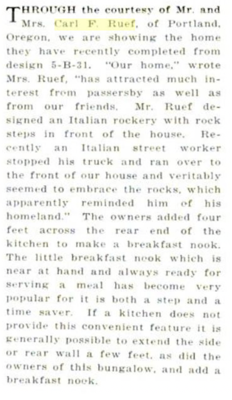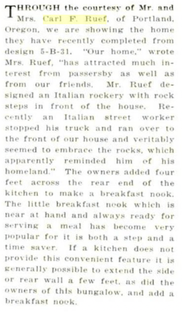 This third home known to be built by Ruef—located on the southeast corner of NE 22nd and Regents—appeared in several publications, including a catalog of building plans published by the Architects’ Small House Service Bureau. Accompanying the 1925 photo above is the following short story and a quote from Florence Ruef about the house and its landscaping: