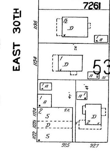 Here it is in the 1924 Sanborn Fire Insurance map, showing it’s pre-address-change addresses of 1122 and 1124 East 30th Street North (downstairs) and 1122 ½ (upstairs). Look in the lower right-hand corner. S=shop. D=dwelling. A=automobile or garage.