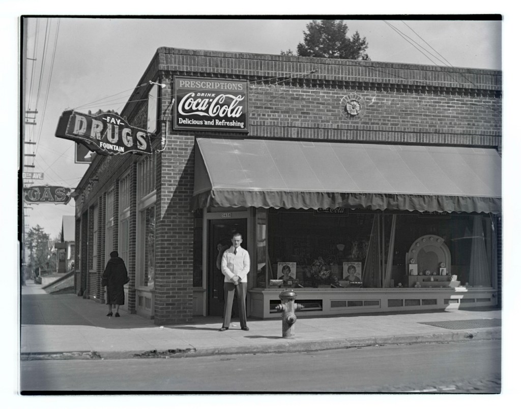 Built in 1927, this commercial block of storefronts has housed everything from Fay’s Drugs and Fountain–pictured here in a photo from the Oregon Journal in 1933–to the RCA Service Company, to the Portland Venetian Blind Company. In the 1950s it was home to neighborhood dentist Dr. Tinkle. More recently, it’s been a coffee shop and café, a bar and a game arcade.