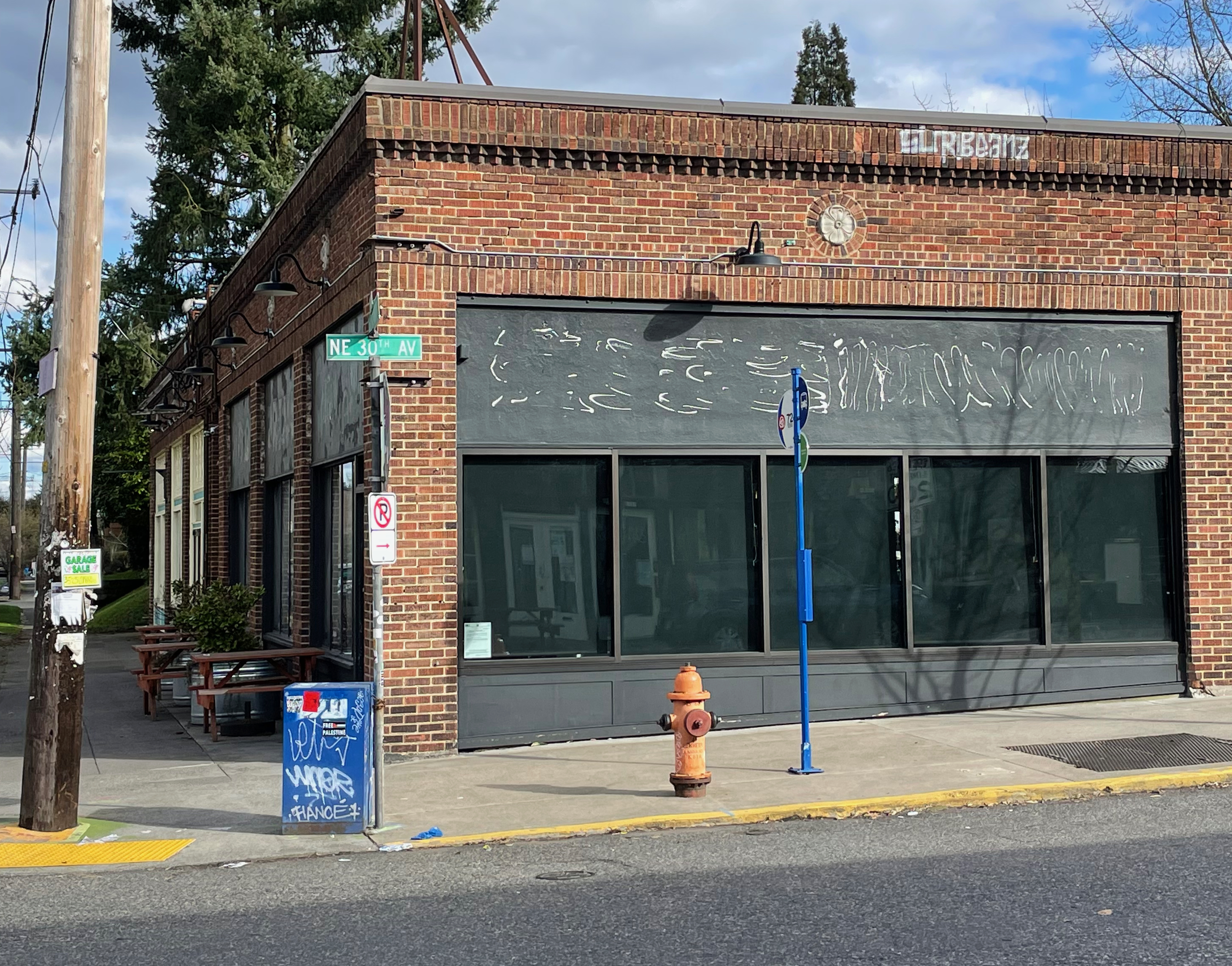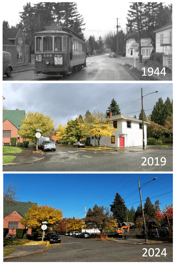 Top: View looking east, Joseph Laurence Fay (1906-1951) poses in front of his business at the southeast corner of NE 30th and Killingsworth in 1933. Photo from the Oregon Journal Negative Collection at the Oregon Historical Society, Lot 1368; Box 372; 372A1209. Bottom: The same view in March 2024, when this storefront was in transition.