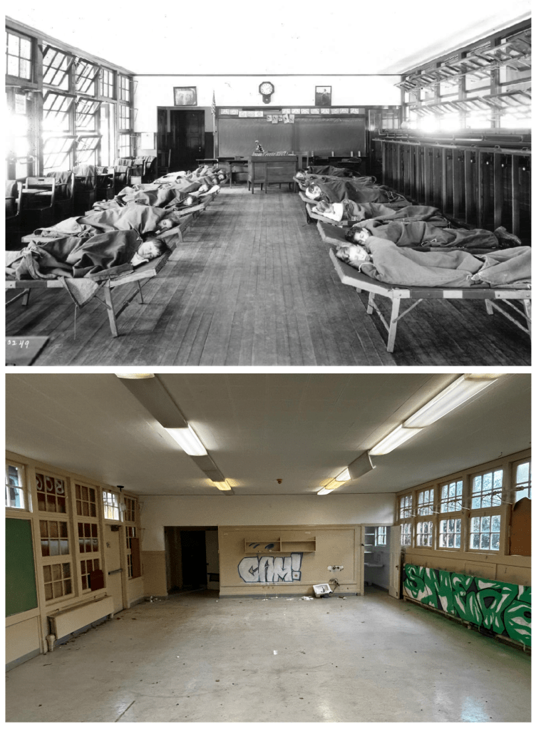 The east classroom at the A.L. Mills Open Air School in the early 1920s and today. Early photo courtesy of the Oregon Historical Society, from the Ben Gifford Collection Box 8, File 5.Current photo by author.